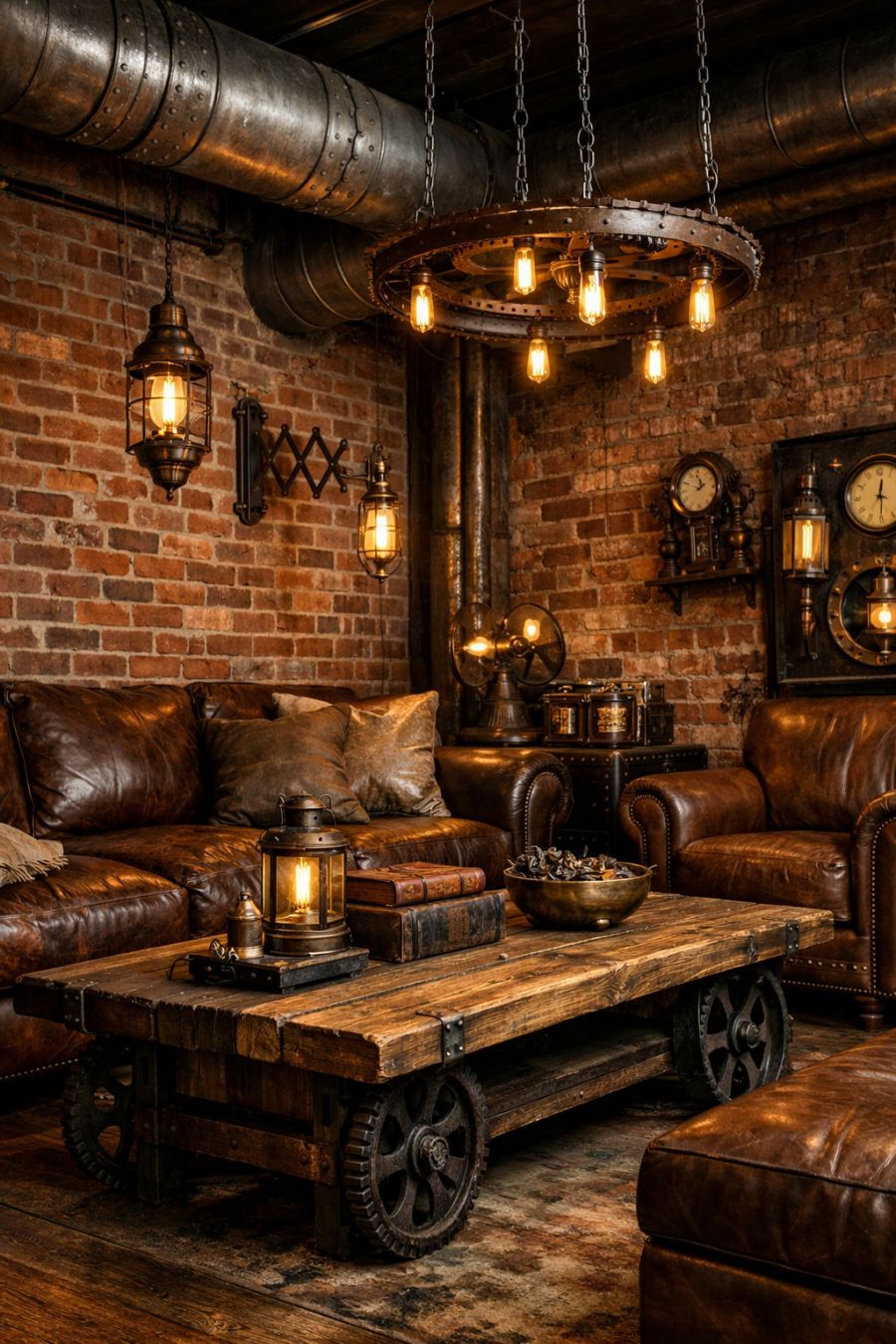 Step inside, and you'll find yourself in a world transformed by an industrial steampunk aesthetic. Exposed brick walls provide a striking backdrop, contrasting beautifully with sleek metal fixtures and rugged wood accents. The living area feels expansive yet cozy, with open ductwork and vintage-inspired lighting fixtures casting a warm glow. Plush leather seating and reclaimed wood coffee tables add to the ambiance, creating a space that is both stylish and comfortable.