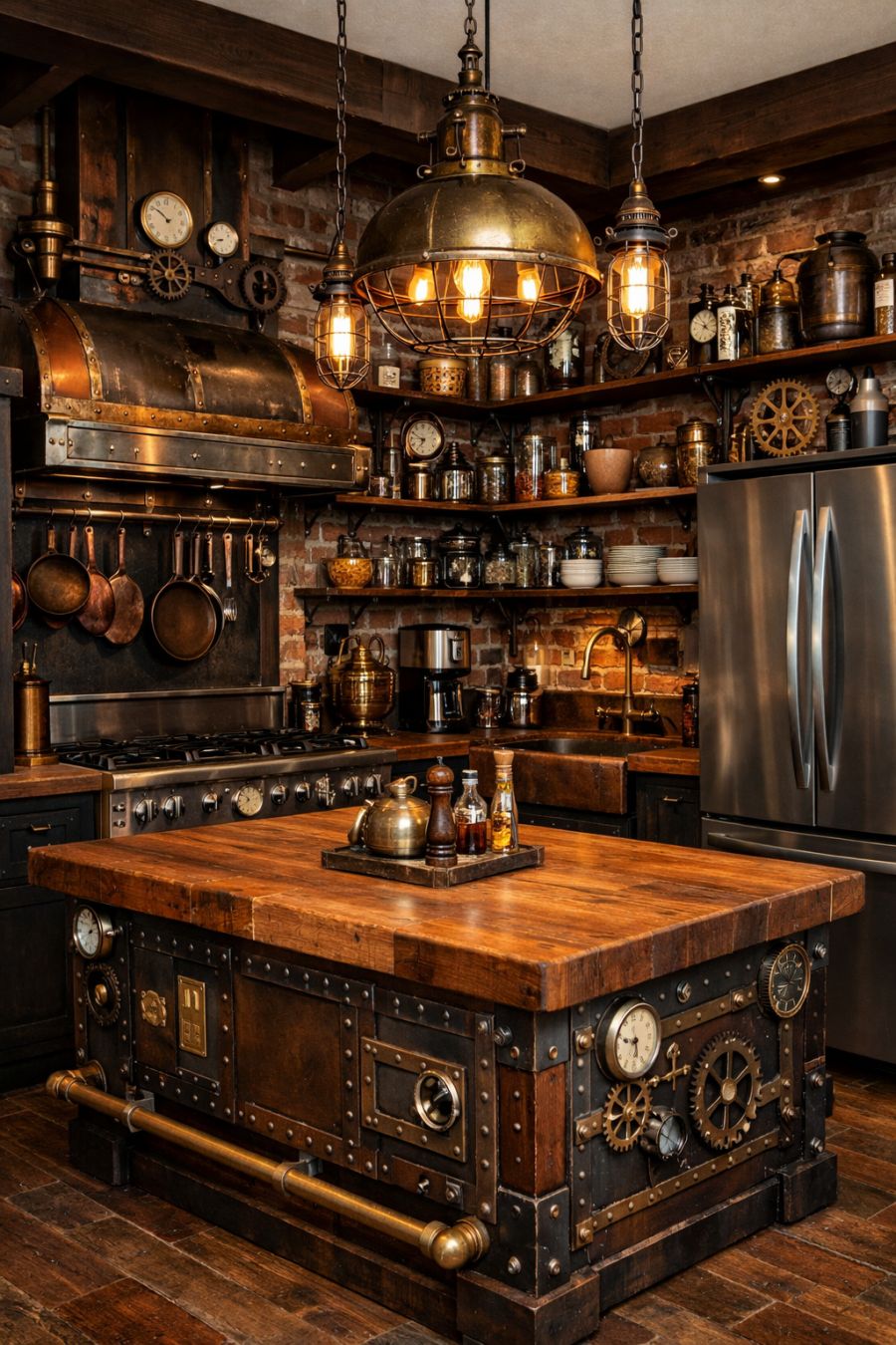 In the kitchen, the steampunk influence is evident in every detail. Stainless steel appliances contrast with rustic brick walls, creating a space that is both functional and full of character. Open shelving displays an eclectic mix of cookware and vintage finds, adding to the kitchen's unique charm. Industrial lighting fixtures and a large, central island with a butcher block top make this space a chef's dream, blending form and function seamlessly.