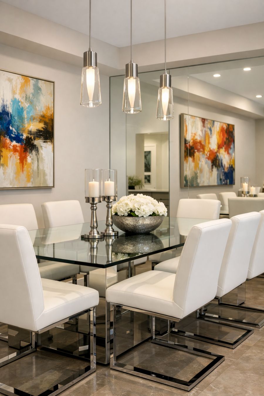 The dining area continues the theme of modern elegance, featuring a striking glass dining table surrounded by chrome-legged chairs upholstered in white leather. Pendant lights hang above, casting a soft glow that enhances the room's sophisticated ambiance. A wall-length mirror adds depth and an illusion of space, while abstract art pieces provide splashes of color and intrigue. The overall design is a seamless blend of functionality and style.