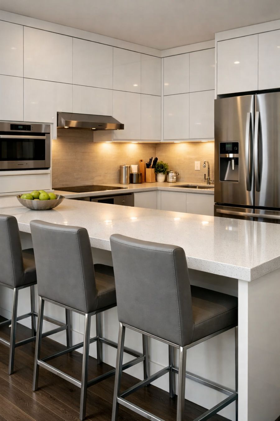 In the kitchen, the sleek design ethos is maintained with handle-less cabinets in a glossy white finish that create a seamless look. Stainless steel appliances integrate effortlessly into the space, offering both form and function. The island, with its polished quartz countertop, serves as a focal point, doubling as a breakfast bar with high-backed stools. Under-cabinet lighting adds a warm glow, highlighting the meticulous attention to detail in this modern culinary hub.