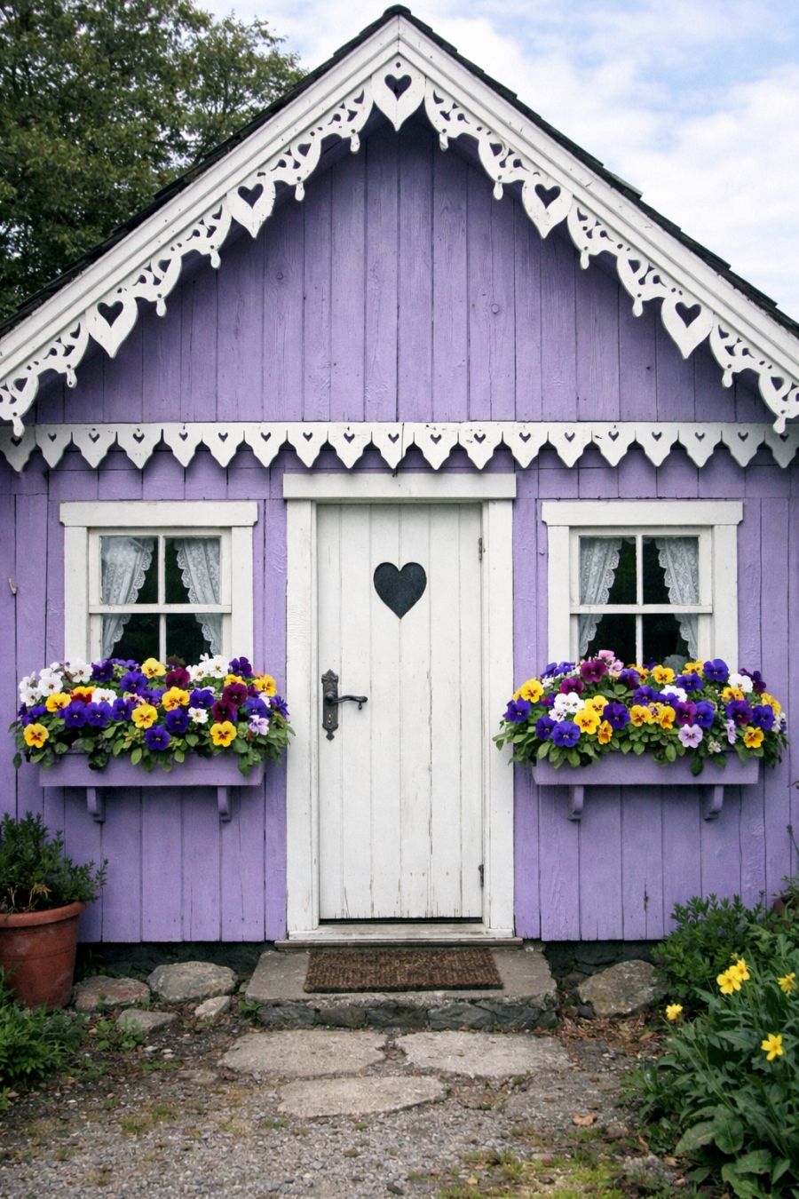 The cottage presents a delightful, whimsical façade with its lilac purple painted wood that immediately catches the eye. The intricate scalloped eaves create a delicate lace-like trim, giving the cottage an air of vintage elegance. Window boxes, overflowing with bright spring pansies in a riot of colors, add a vibrant touch to the front-facing view. The overall effect is one of a charming fairy-tale abode, captured perfectly in an amateur photograph that highlights its quaint appeal.