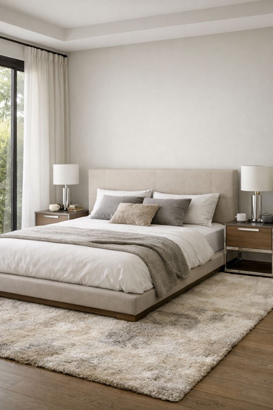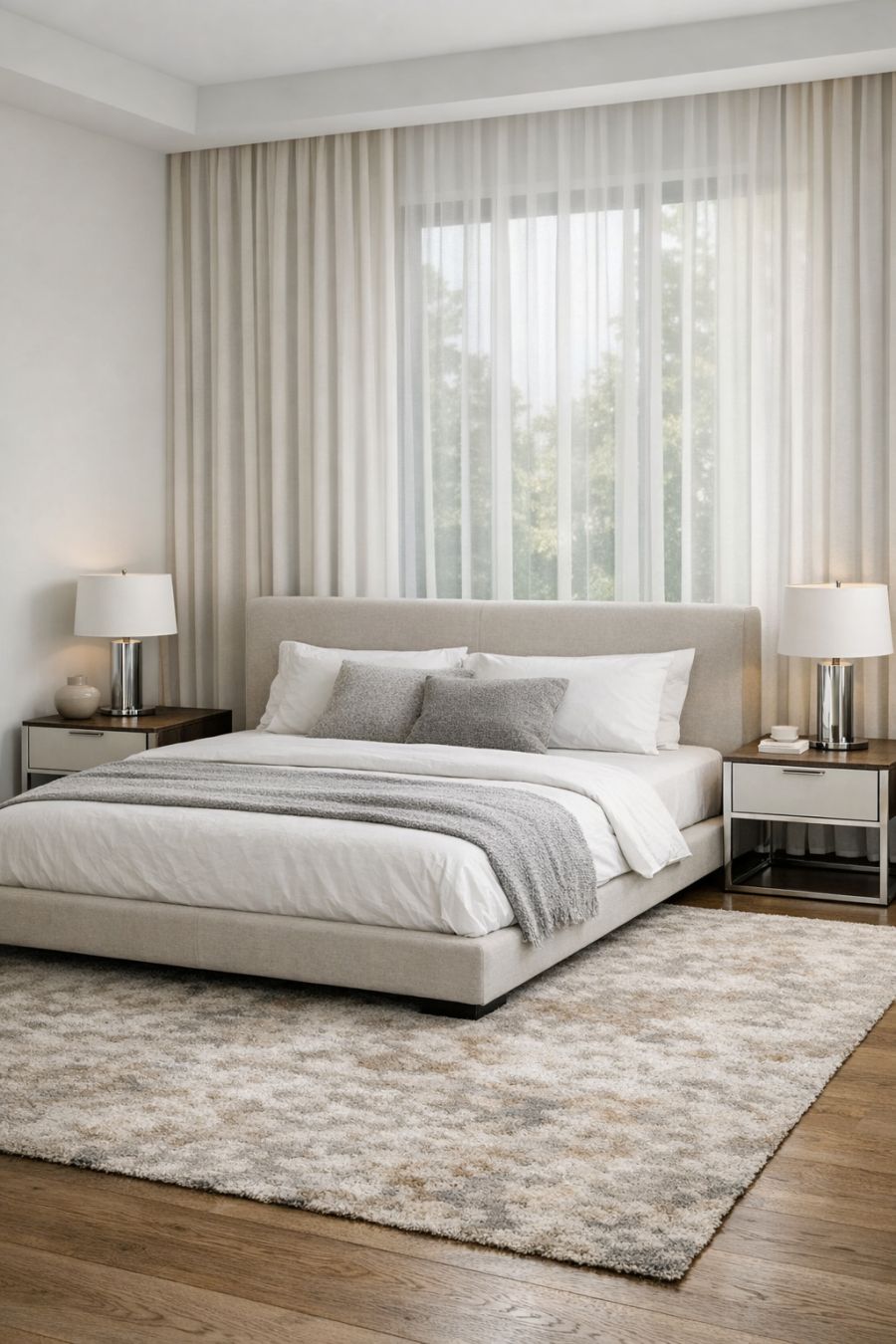The bedroom offers a tranquil retreat with its minimalist design and emphasis on comfort. A platform bed with a low-profile frame and upholstered headboard takes center stage, complemented by nightstands with chrome accents. Floor-to-ceiling windows allow natural light to flood the space, softened by sheer curtains. The palette of muted tones is accented by a plush area rug, adding warmth and texture to the room.
