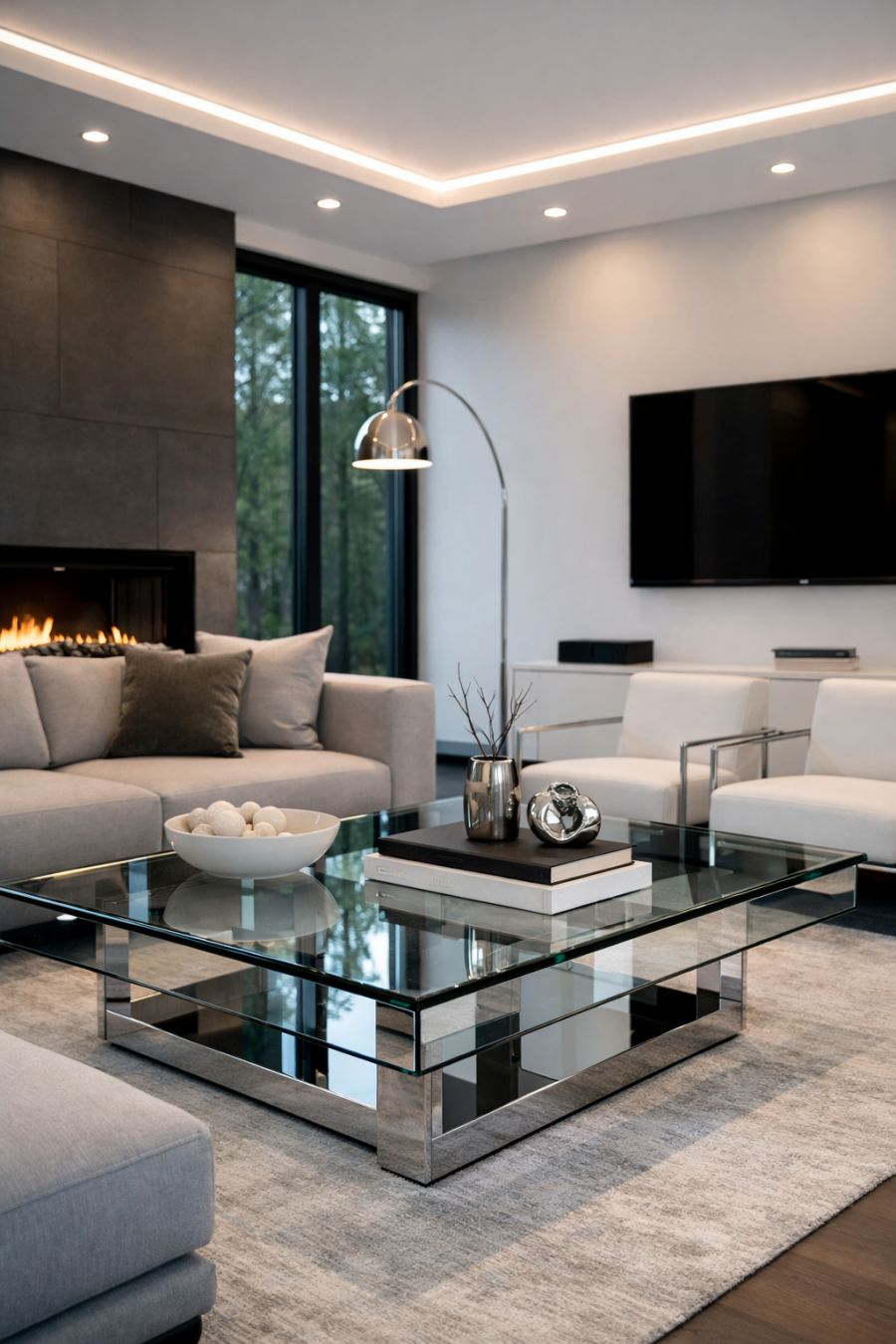 Stepping inside, the living area is nothing short of a modern marvel. The sleek chrome accents and expansive glass surfaces create an open, airy atmosphere. Minimalist furniture pieces, with their clean lines and neutral tones, contribute to the contemporary aesthetic. A large glass coffee table serves as the centerpiece, reflecting light from the strategically placed LED fixtures that illuminate the space.