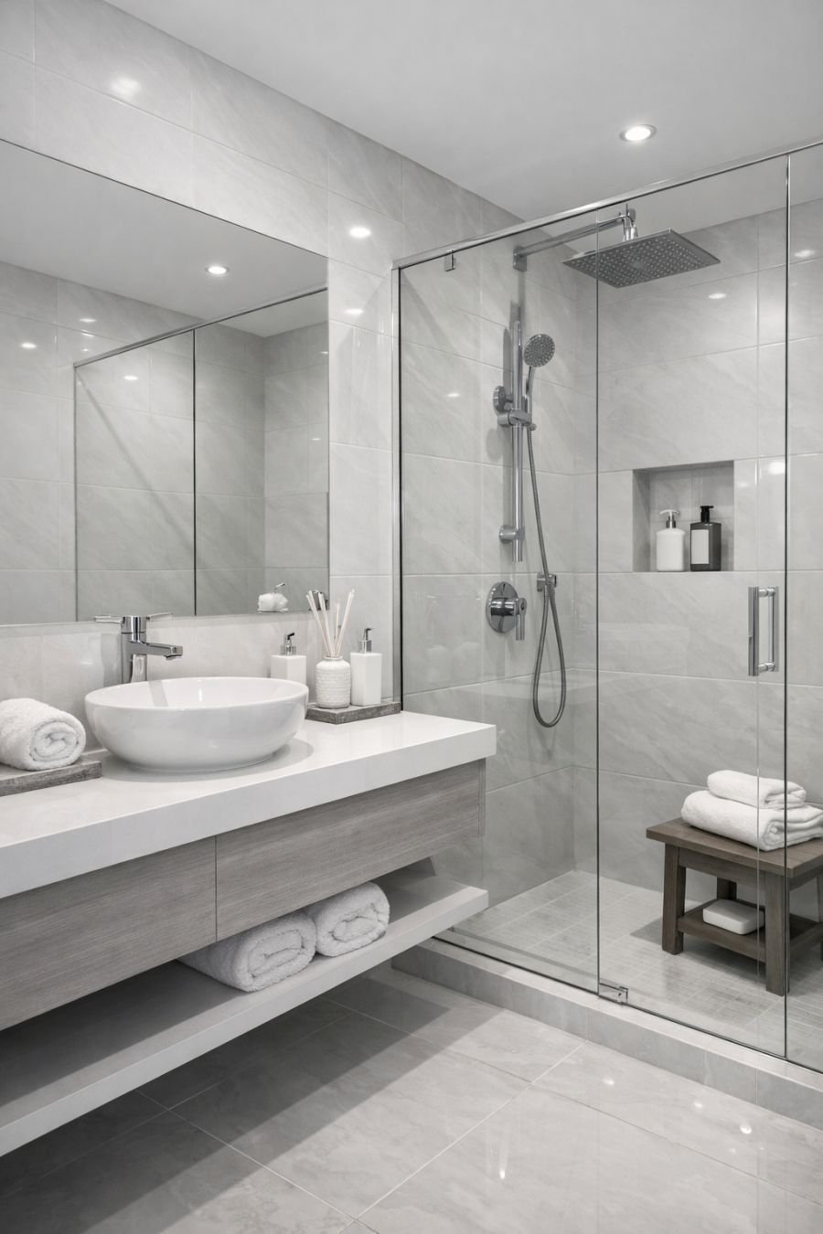 The bathroom is a spa-like haven, featuring a clean, monochromatic color scheme of whites and grays. Large, glossy tiles line the walls and floor, enhancing the sense of space and luxury. A floating vanity with a vessel sink and a large mirror creates a modern yet functional focal point. The walk-in shower, enclosed in frameless glass, boasts a rainfall showerhead, providing a relaxing and invigorating experience. Every element is designed for ease of use, without sacrificing style.