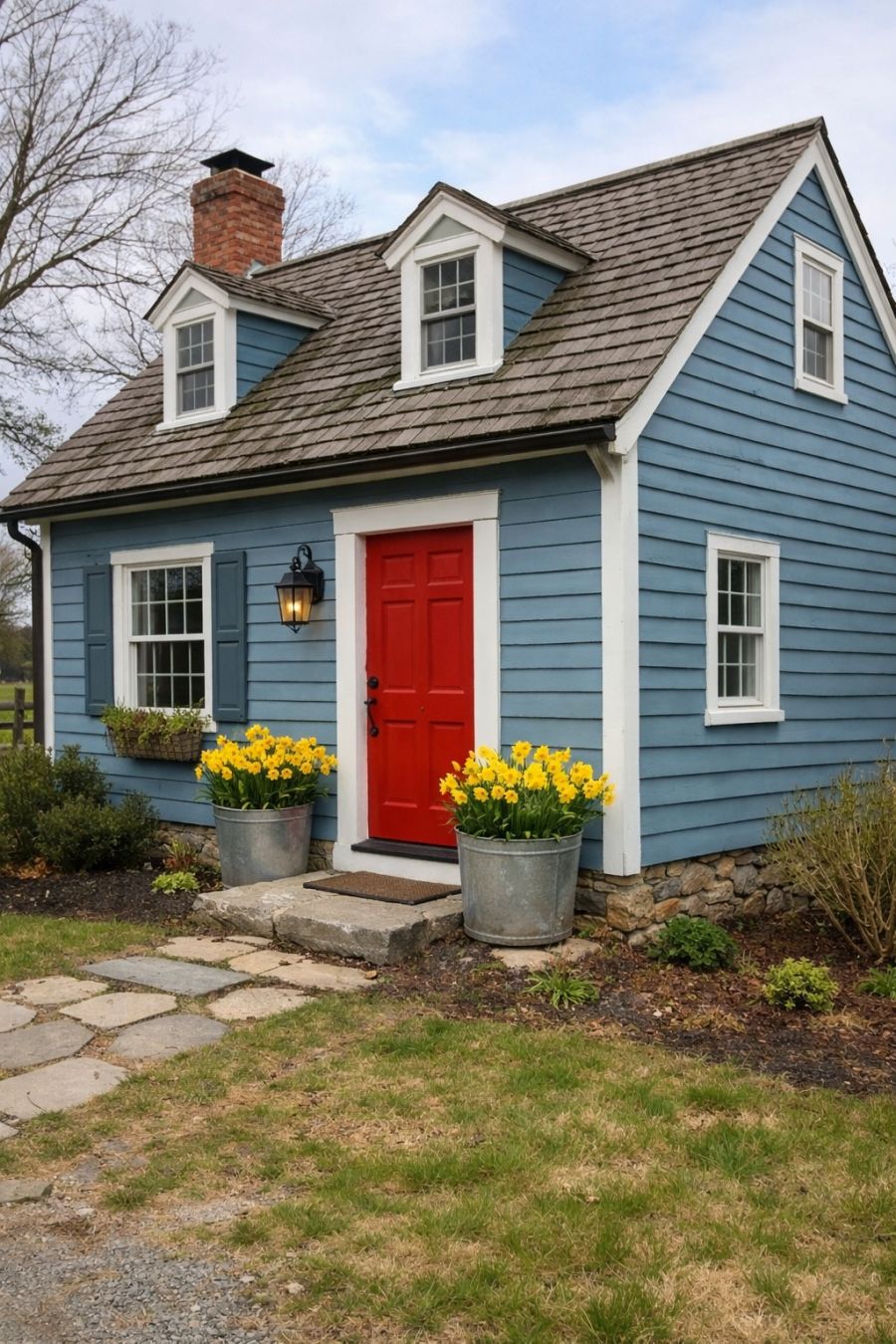 From the outside, this house presents itself as a picture-perfect cottage, with its dusty blue painted clapboard siding that exudes timeless charm. The bright cherry red front door serves as a cheerful focal point, inviting visitors to step inside. Flanking the entrance, zinc planters brimming with vibrant yellow spring daffodils add a touch of rustic elegance. The 3/4 angled view of the house, captured in amateur photography, enhances its welcoming and homey appearance, making it a perfect fit for a tranquil countryside setting.
