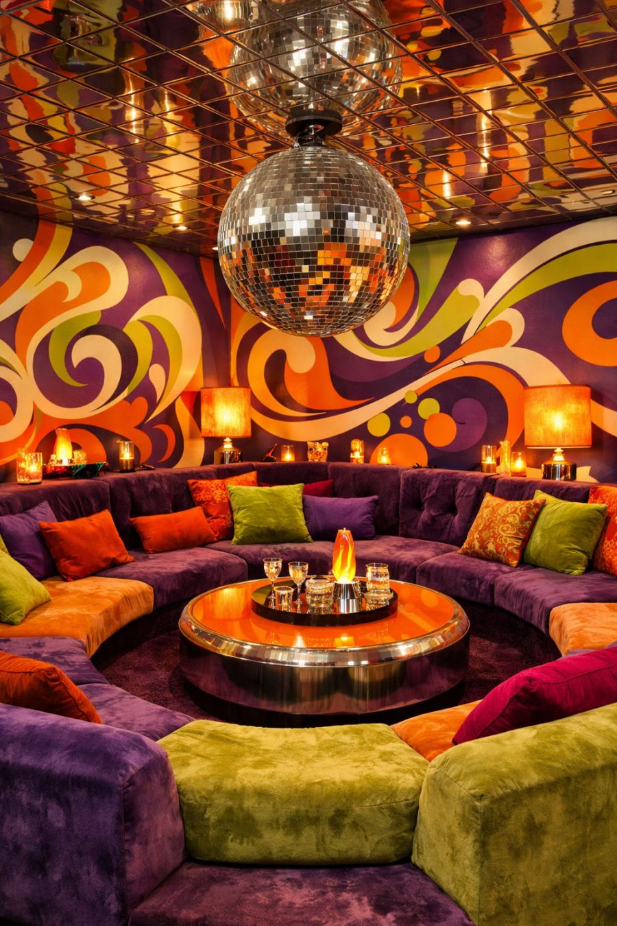 Stepping into the living area, visitors are immediately transported to a psychedelic wonderland reminiscent of a 1970s disco. The walls are adorned with swirling patterns in bold hues of orange, purple, and lime green, creating a lively and dynamic atmosphere. A sunken conversation pit, lined with plush velvet seating, invites guests to gather and relax. The ceiling boasts a dazzling array of mirrored tiles, which reflect the light from a striking, oversized disco ball, casting playful reflections around the room.