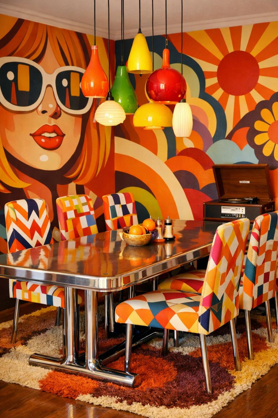 The dining area continues the retro theme with a long, sleek table made from polished chrome, paired with high-backed chairs upholstered in vivid, geometric prints. Above the table hangs a cluster of pendant lights in various shapes and colors, adding to the eclectic vibe. The walls feature large, bold murals that capture the essence of 1970s pop art, providing a vibrant backdrop for lively dinner parties. A vintage record player in the corner stands ready to provide the perfect soundtrack for any meal.