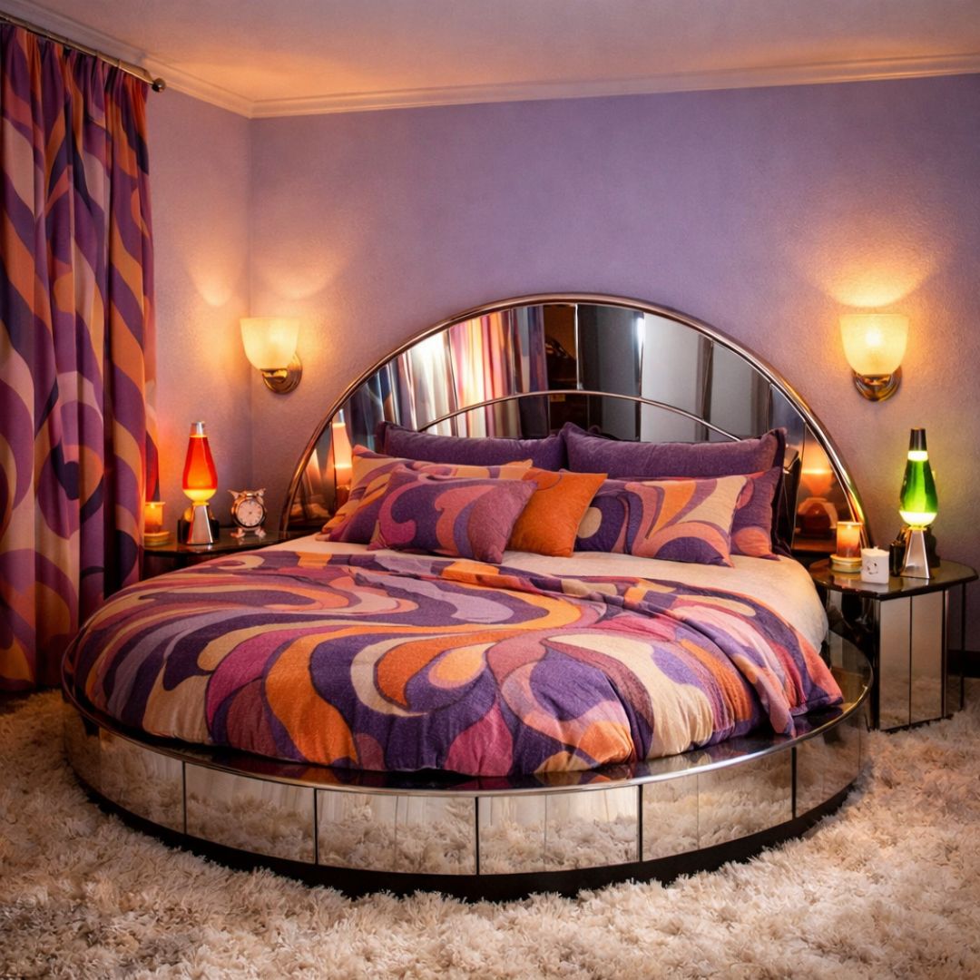The bedroom offers a more subdued take on the disco theme, with a focus on comfort and relaxation. Walls are painted in a soft lavender hue, providing a calming backdrop for the bold, psychedelic patterns of the bedspread and curtains. A circular bed with a mirrored headboard serves as the room's centerpiece, surrounded by plush shag carpeting that invites barefoot strolls. Ambient lighting, provided by lava lamps and dimmable sconces, creates a soothing and intimate atmosphere.