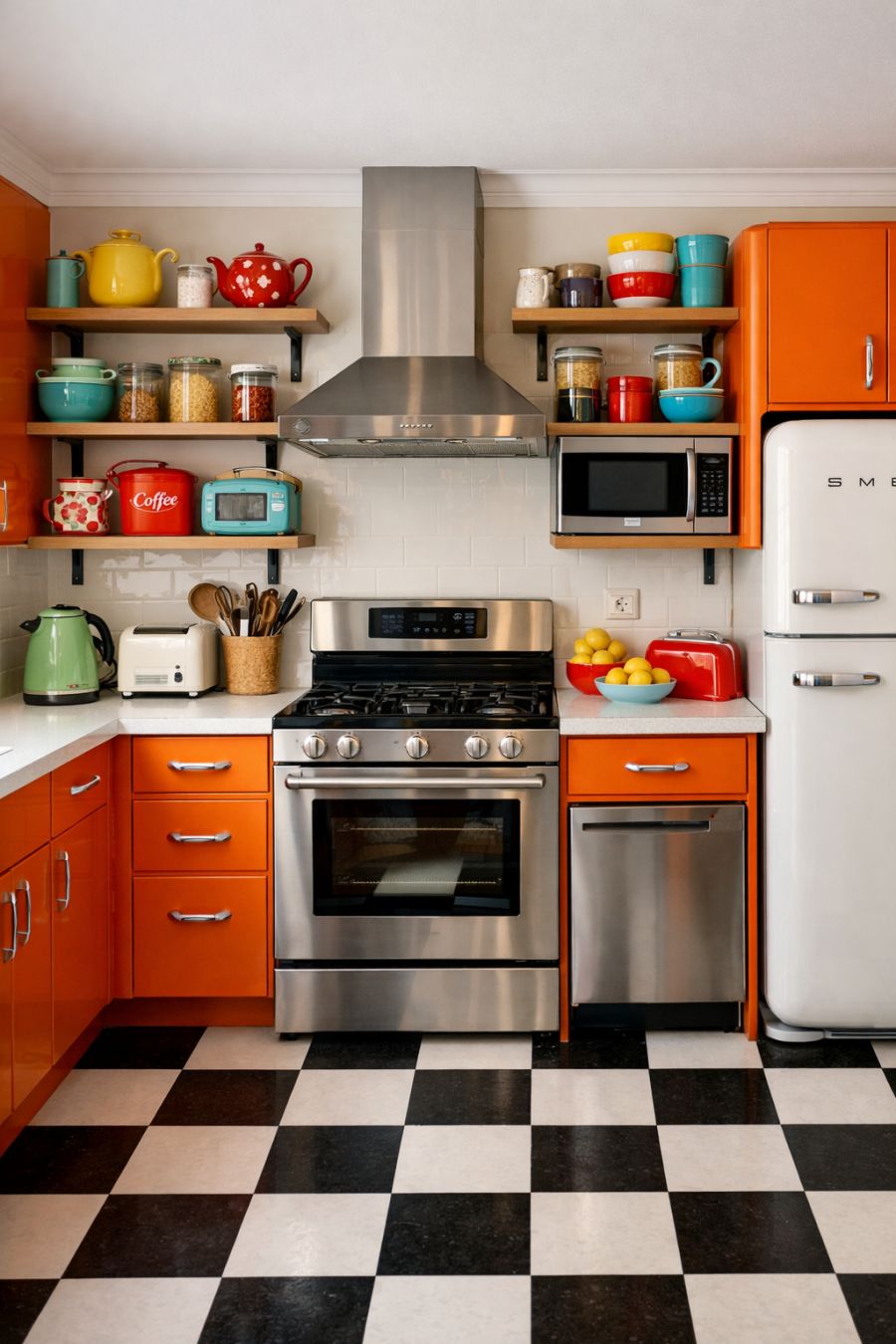 The kitchen is a delightful fusion of retro flair and modern functionality. Bright orange cabinets with rounded edges and chrome handles make a bold statement against the sleek, white countertops. A checkerboard floor in alternating black and white tiles adds a classic touch, while open shelving displays an array of colorful, vintage kitchenware. State-of-the-art appliances are cleverly integrated, ensuring that the nostalgic aesthetic does not compromise convenience or efficiency.