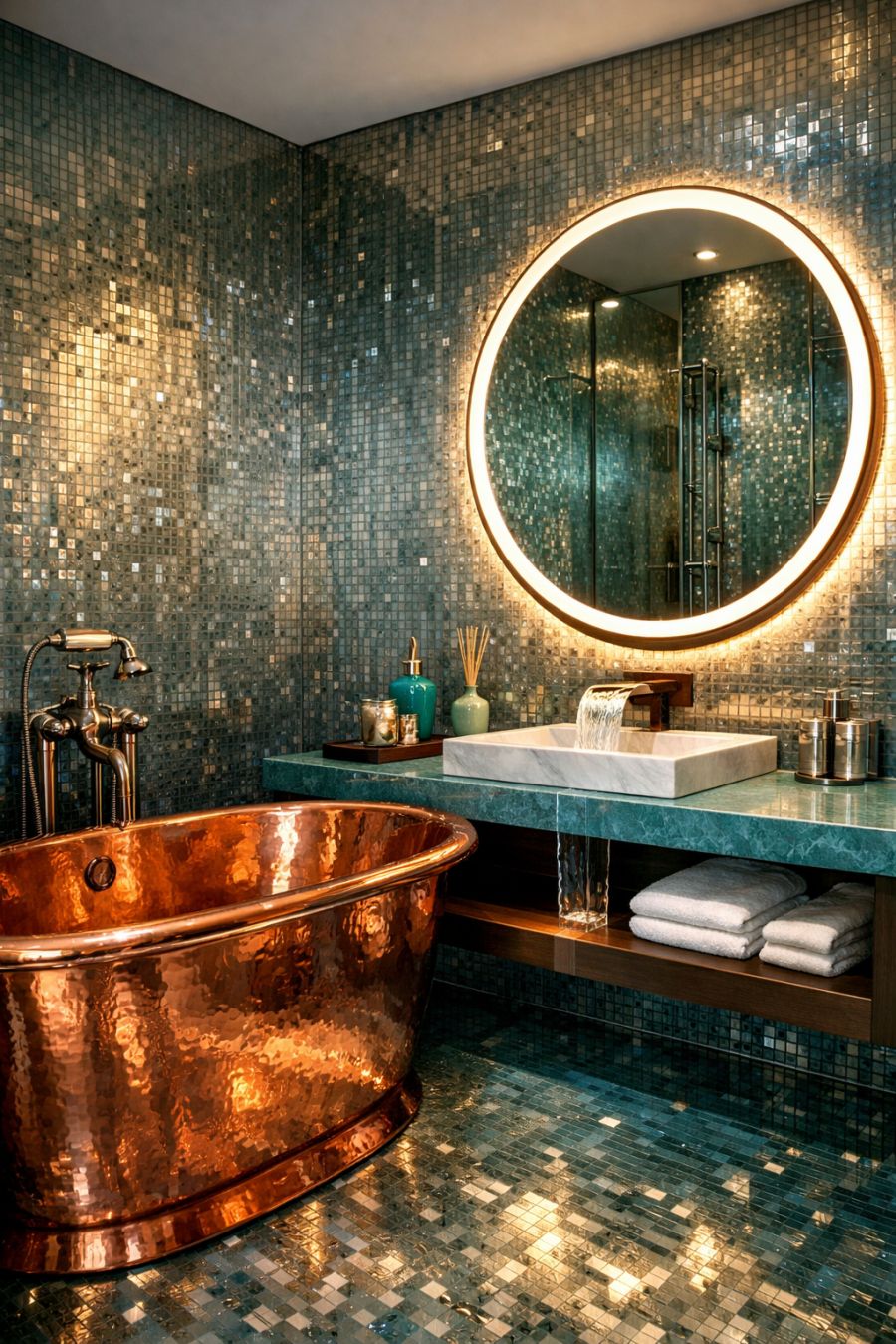 The bathroom is a stylish retreat that continues the home's unique design ethos. The walls are covered in sleek, reflective tiles that shimmer under the light, creating the illusion of a larger space. A freestanding bathtub, crafted from polished copper, serves as a luxurious focal point. The vanity area features a floating sink with a waterfall faucet, while the round mirror above is framed with a halo of LED lights. The color scheme of turquoise and silver adds a touch of elegance, ensuring the bathroom is both functional and visually stunning.