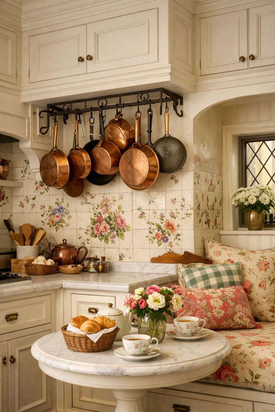 In the kitchen, the commitment to classic English style is evident in the choice of materials and finishes. White cabinetry with intricate moldings provides ample storage, while marble countertops add a touch of elegance and practicality. The backsplash features hand-painted tiles with floral motifs, a nod to the chintz theme that runs throughout the home. Copper pots and pans hang from a wrought iron rack, ready for use in the creation of culinary delights. A cozy breakfast nook, complete with a floral cushion-topped bench, invites intimate morning conversations.