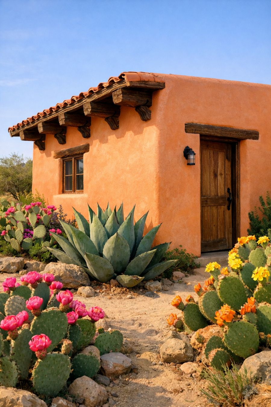 As you approach the cottage, the striking contrast between its exterior and interior becomes apparent even before stepping inside. The smooth adobe walls are painted a peachy orange, their warm hue resonating with the desert sun. Rustic wooden corbels jut out, adding character and a hint of traditional craftsmanship to the facade. The landscape is alive with vibrant green agave plants and spring cacti in full bloom, providing a rich tapestry of color and texture against the cottage's simple, elegant backdrop. This picturesque scene is captured with an amateur's eye, lending authenticity and charm to the overall composition.