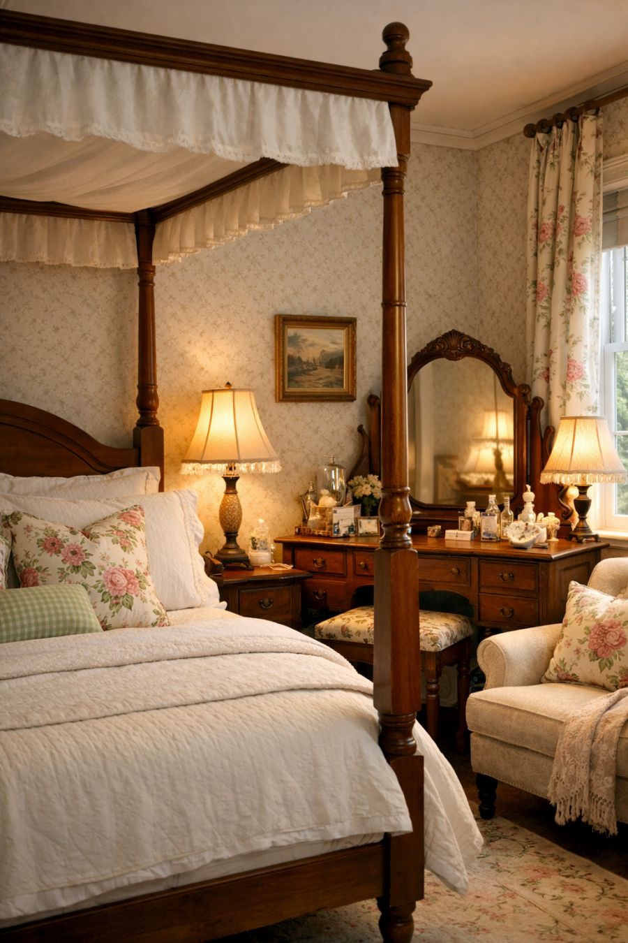 The bedroom is a sanctuary of comfort and charm, with a four-poster bed dressed in crisp white linen and floral accent pillows. The walls are papered in a subtle, complementary pattern, creating a sense of continuity with the rest of the home. An antique vanity stands in one corner, its surface cluttered with perfume bottles and trinkets, while a plush armchair sits by the window, offering a perfect spot for reading or daydreaming. Soft lighting from vintage lamps creates a soothing ambiance, perfect for unwinding after a long day.