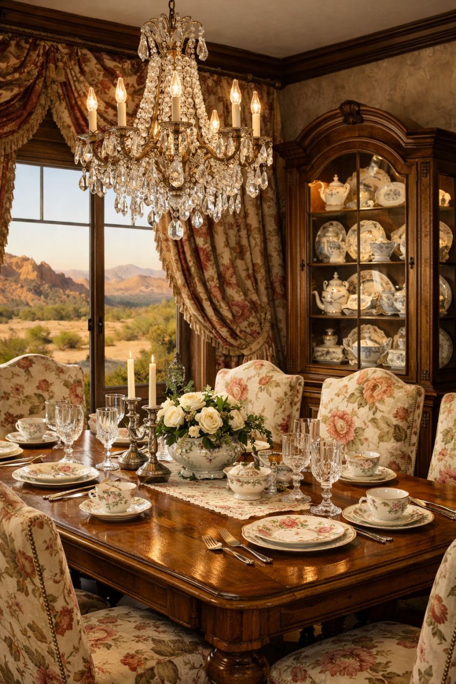 The dining area continues the theme of English elegance with its grand oak table, surrounded by high-backed chairs upholstered in floral fabric. A crystal chandelier hangs overhead, casting a gentle glow that highlights the intricate patterns on the china displayed in a corner cabinet. Heavy drapes, reminiscent of an English manor, frame the windows, offering a view of the desert landscape outside. The room exudes a sense of refined luxury, where every meal feels like a special occasion.