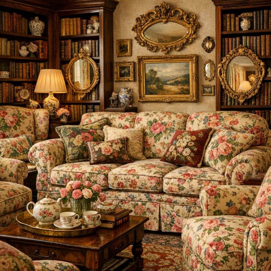 Stepping into the living area is like entering a different world. Gone are the minimalist tones of the exterior; in their place is an explosion of classic English chintz floral patterns. Every piece of furniture, from the plush armchairs to the well-stuffed sofa, is upholstered in this timeless fabric, creating an atmosphere of warmth and coziness. The walls are adorned with an eclectic mix of gilt-framed paintings and vintage mirrors, each contributing to the room's inviting and lived-in feel. Rich mahogany bookcases line the walls, filled with leather-bound tomes and decorative trinkets that tell stories of faraway places.