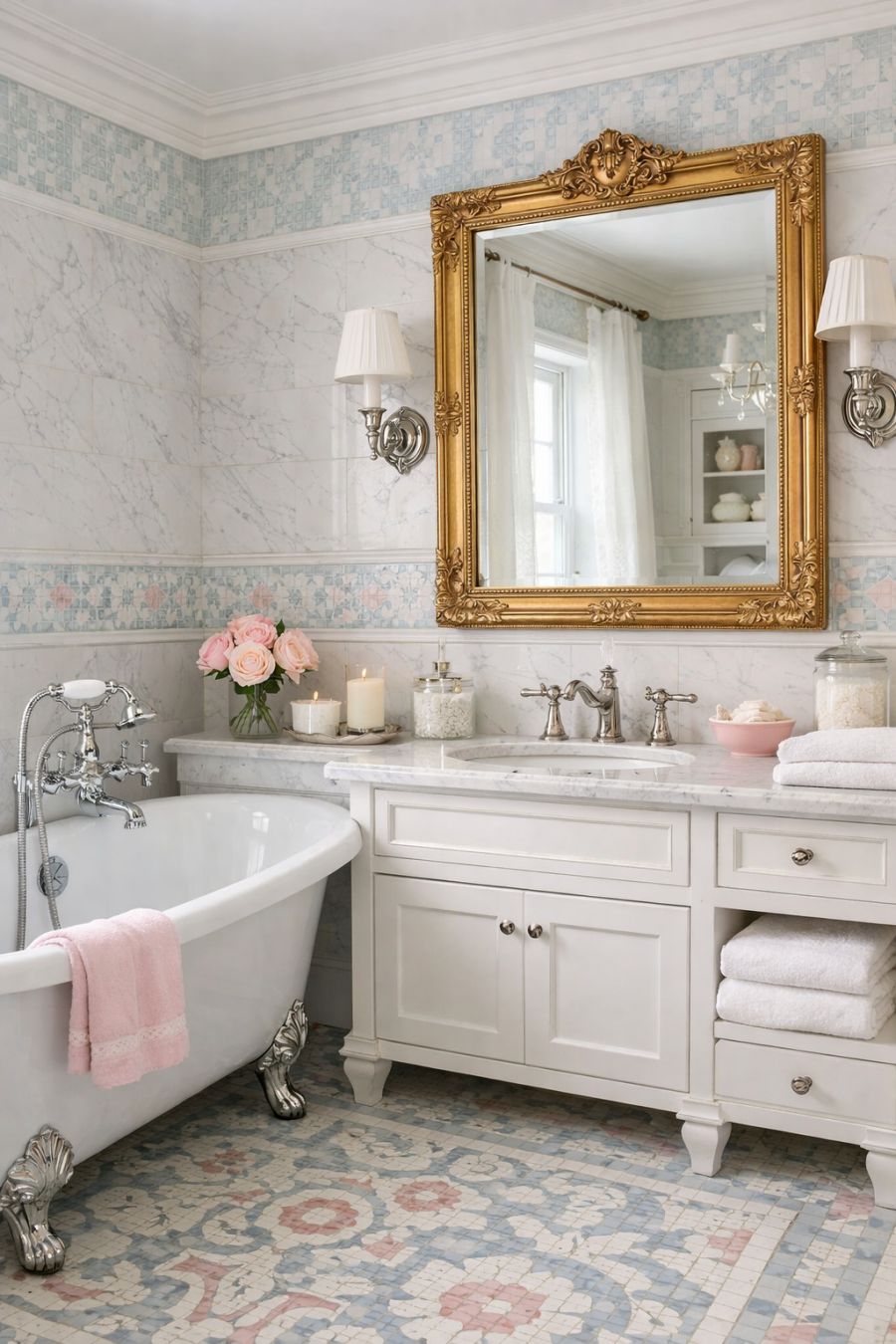 The bathroom is a study in elegance and functionality, featuring a clawfoot tub that invites relaxation and reflection. The color scheme is a harmonious blend of soft pastels, with pale blues and pinks accentuating the white fixtures. Marble surfaces and polished chrome faucets add a touch of luxury, while intricate tile work on the floors and walls provides visual interest. A large, gilt-framed mirror reflects the room's beauty, enhancing the sense of space and light. The layout is designed for ease of use, with ample storage and thoughtful placements of each element.