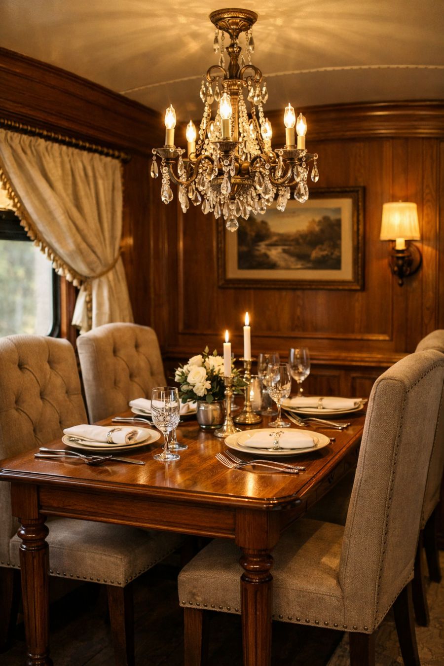 The dining area continues the theme of traditional elegance, with a compact yet beautifully crafted wooden dining table. Surrounded by high-backed chairs upholstered in a soft, muted fabric, the space feels intimate and refined. Overhead, a delicate chandelier casts a warm glow, adding to the room's cozy atmosphere. The table is set with fine china and polished silverware, creating a dining experience that feels both special and everyday.