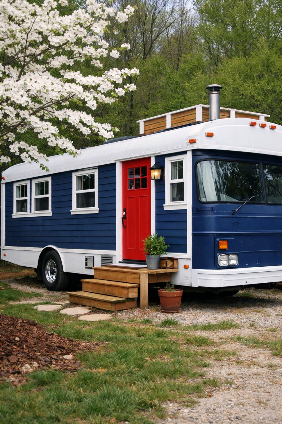 The exterior of this converted bus is a striking vision of colonial charm and contemporary ingenuity. The navy blue clapboard siding, meticulously applied to the bus's frame, gives it a stately presence, enhanced by the crisp white trim that outlines its edges. A vibrant red door offers a bold contrast, serving as an inviting focal point against the deep blue facade. Nestled amidst a blooming white dogwood tree, the bus exudes a sense of harmony with its surroundings, captured beautifully in amateur photography that highlights its welcoming, homely appearance.