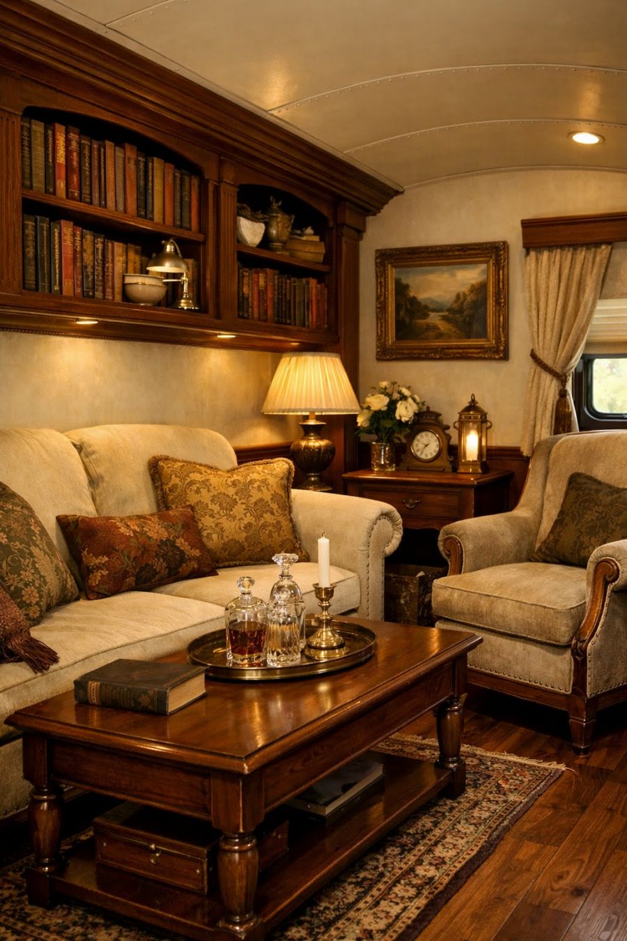 Step inside, and you're greeted by a living area that resonates with classical elegance. The interiors feature rich wooden flooring that adds warmth and sophistication, complemented by soft cream walls that enhance the sense of space. A cozy seating area with plush, upholstered furniture invites relaxation, while built-in bookshelves filled with classic literature evoke a sense of timeless charm. Thoughtful arrangements of vintage-inspired decor pieces create an ambiance that is both inviting and refined.