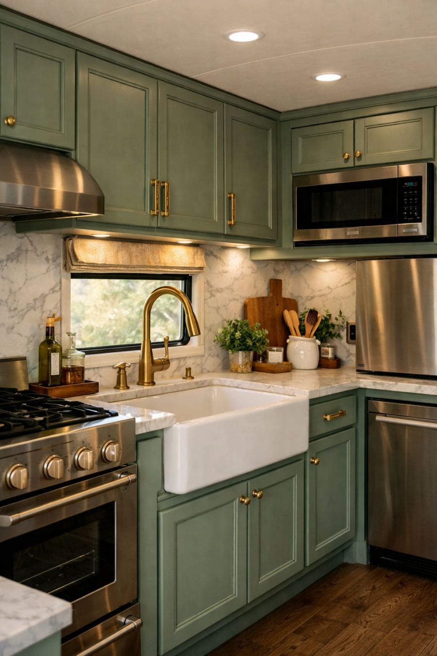 In the kitchen, modern functionality meets classic style. Custom cabinetry in a soft, muted green provides ample storage, while brass hardware adds a touch of vintage charm. The countertops are a polished marble, offering both beauty and durability, and a farmhouse sink is perfectly integrated, combining practicality with style. High-end appliances are seamlessly incorporated, ensuring the kitchen is both efficient and aesthetically pleasing.