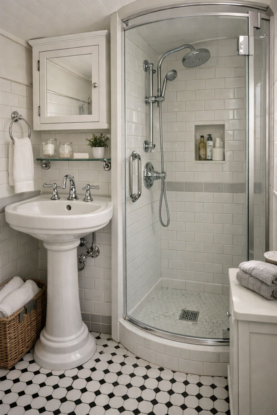 The bathroom is a study in elegance and functionality, featuring a palette of soft whites and muted greys. The space is grounded by a classic tiled floor, while the walls are adorned with subway tiles that evoke a sense of clean sophistication. A pedestal sink complements the room's vintage aesthetic, and polished chrome fixtures add a touch of modern shine. The layout is efficient, with a glass-enclosed shower that maximizes space while maintaining an open feel.