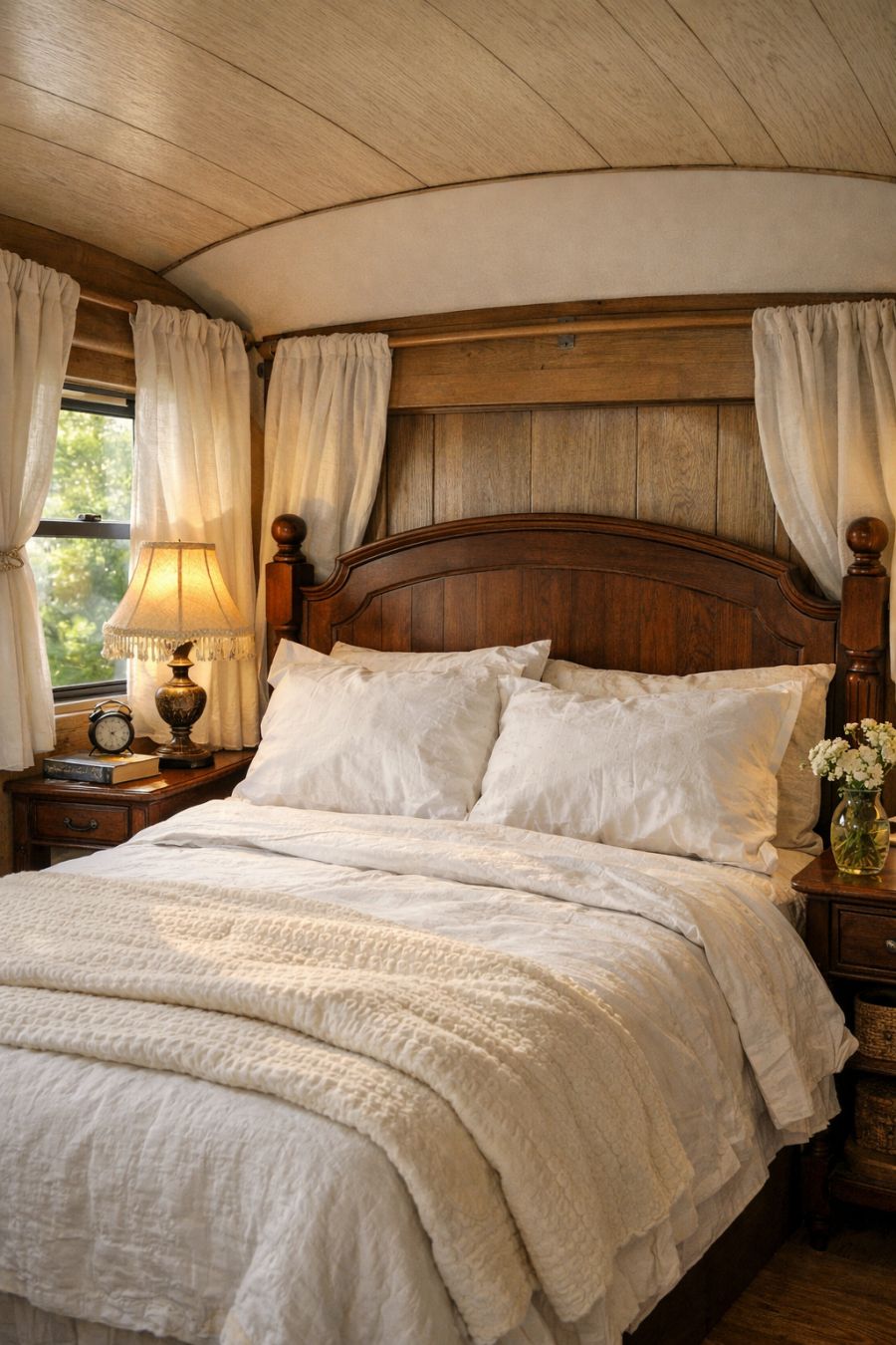 The bedroom area is a serene retreat, designed with comfort and elegance in mind. A full-sized bed with a classic wooden headboard is the focal point, dressed in crisp white linens and a cozy quilt. Windows are adorned with soft, flowing curtains that allow natural light to filter in, creating a peaceful ambiance. Thoughtful touches, such as a vintage bedside table and an antique lamp, add to the room's timeless charm.