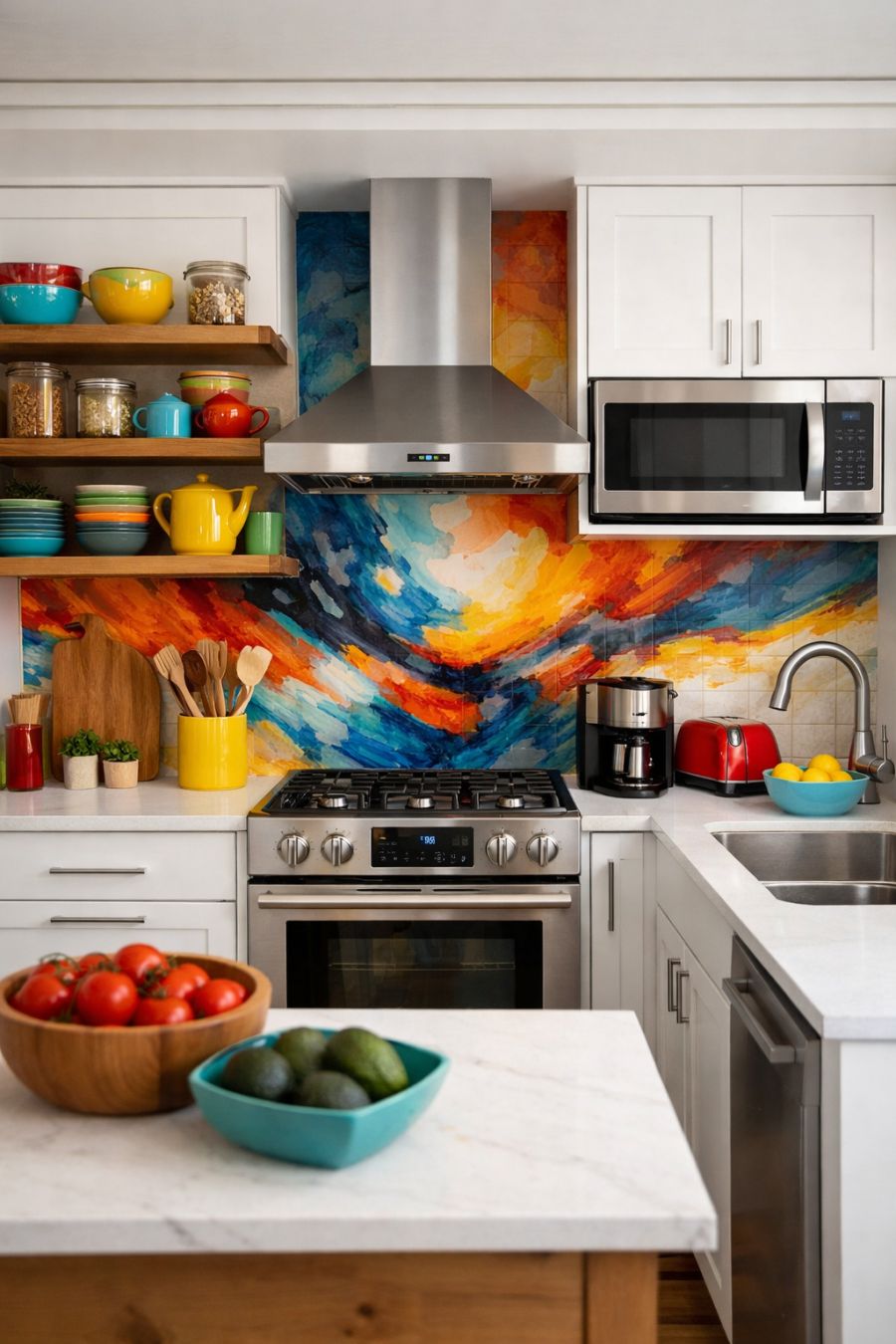 The kitchen is a seamless blend of functionality and style, with sleek white cabinetry providing a clean, minimalist backdrop for the vivid colors that accentuate the space. Stainless steel appliances offer a modern touch, while a bold, art-inspired backsplash becomes a focal point, infusing the room with energy. Open shelving displays an array of colorful dishware, adding to the kitchen's playful aesthetic. The space is both practical and inspiring, designed for culinary creativity and social gatherings.