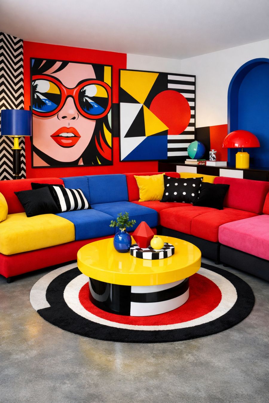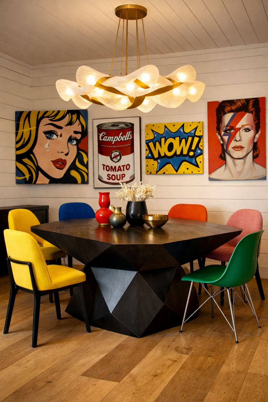 The dining area continues the theme of contemporary boldness, featuring a striking geometric dining table that serves as the room's centerpiece. Surrounding the table are a mix of modern chairs, each sporting a different vivid color, creating a playful yet cohesive ensemble. The walls are adorned with eclectic pop art prints, adding layers of visual interest and conversation-starting pieces. Overhead, a sculptural light fixture casts a warm glow, enhancing the room's inviting atmosphere while maintaining its artistic flair.