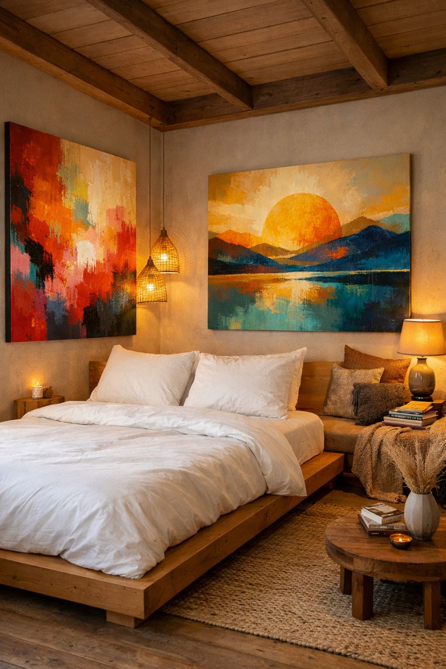 In the bedroom, tranquility meets modern art, creating a serene yet stimulating retreat. The walls are adorned with large, vibrant canvases that introduce a burst of color without overwhelming the space. A low platform bed with crisp, white linens adds a touch of simplicity, allowing the art to take center stage. Soft, ambient lighting creates a peaceful ambiance, while a cozy reading nook invites relaxation, blending comfort with style in this artistic haven.