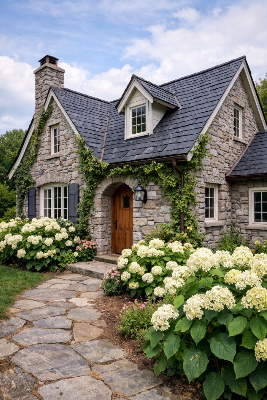 The exterior of this charming cottage is a testament to classic elegance, featuring a soft gray stacked fieldstone facade that exudes a sense of warmth and permanence. The dark charcoal slate roof tiles complement the stonework beautifully, creating a cohesive and sophisticated look. Climbing green ivy weaves its way through the budding hydrangeas, adding a touch of natural beauty and life to the structure. The 3/4 angled view of the cottage reveals its quaint, inviting nature, captured perfectly with an amateur photographer's eye for detail and composition.
