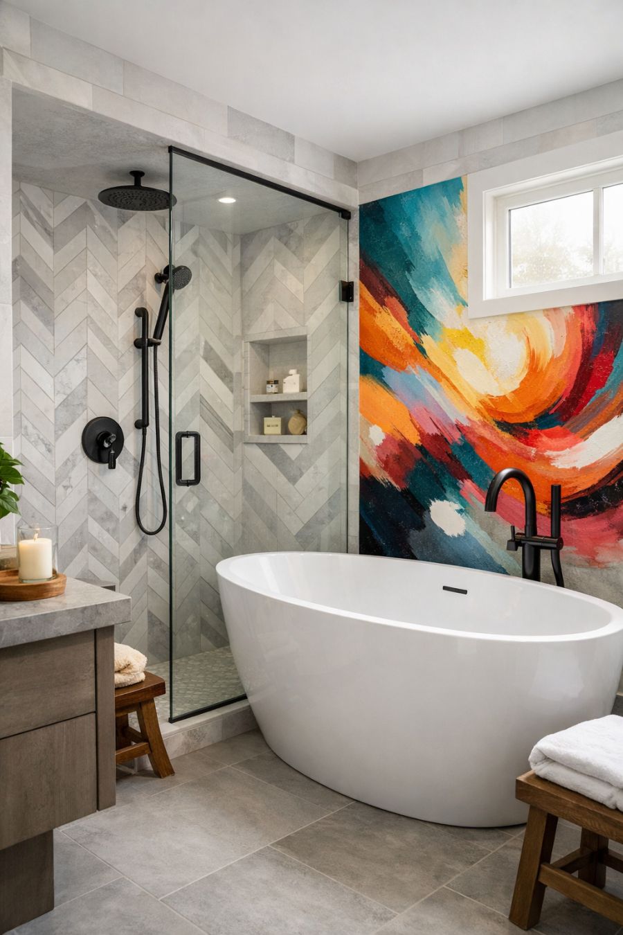 The bathroom offers a spa-like experience with a contemporary twist, featuring sleek, modern fixtures against a backdrop of geometric tilework. The color palette is a soothing blend of whites and grays, punctuated by a vibrant pop of color in the form of a striking abstract mural. A frameless glass shower and a deep, freestanding tub offer luxurious bathing options, while ample natural light enhances the room's airy feel. This space balances functionality with bold design, providing a refreshing start and a relaxing end to each day.