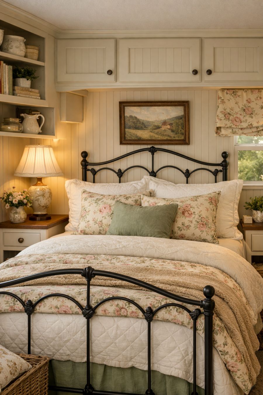 The bedroom is a serene retreat, designed to evoke the tranquility of an English countryside. Soft, muted colors and delicate floral patterns create a soothing environment conducive to relaxation. A wrought iron bed frame, topped with plush bedding and layered with cozy quilts, invites rest and rejuvenation. The room's small size is cleverly utilized with built-in shelves and storage, ensuring a clutter-free sanctuary that feels both spacious and intimate.