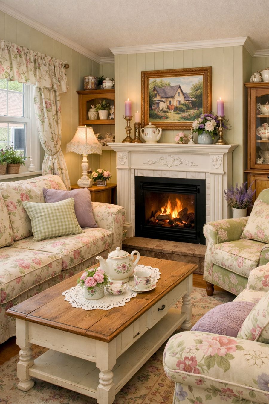 Stepping inside, the living area transports you into a quaint English cottage garden setting. The space is adorned with floral-patterned upholstery and vintage wooden furniture, creating a warm and inviting atmosphere. Soft pastel colors dominate the palette, with light greens and lavenders echoing the serenity of a garden in bloom. A small fireplace with a classic mantelpiece adds both warmth and a focal point, completing the cozy, timeless feel of the room.