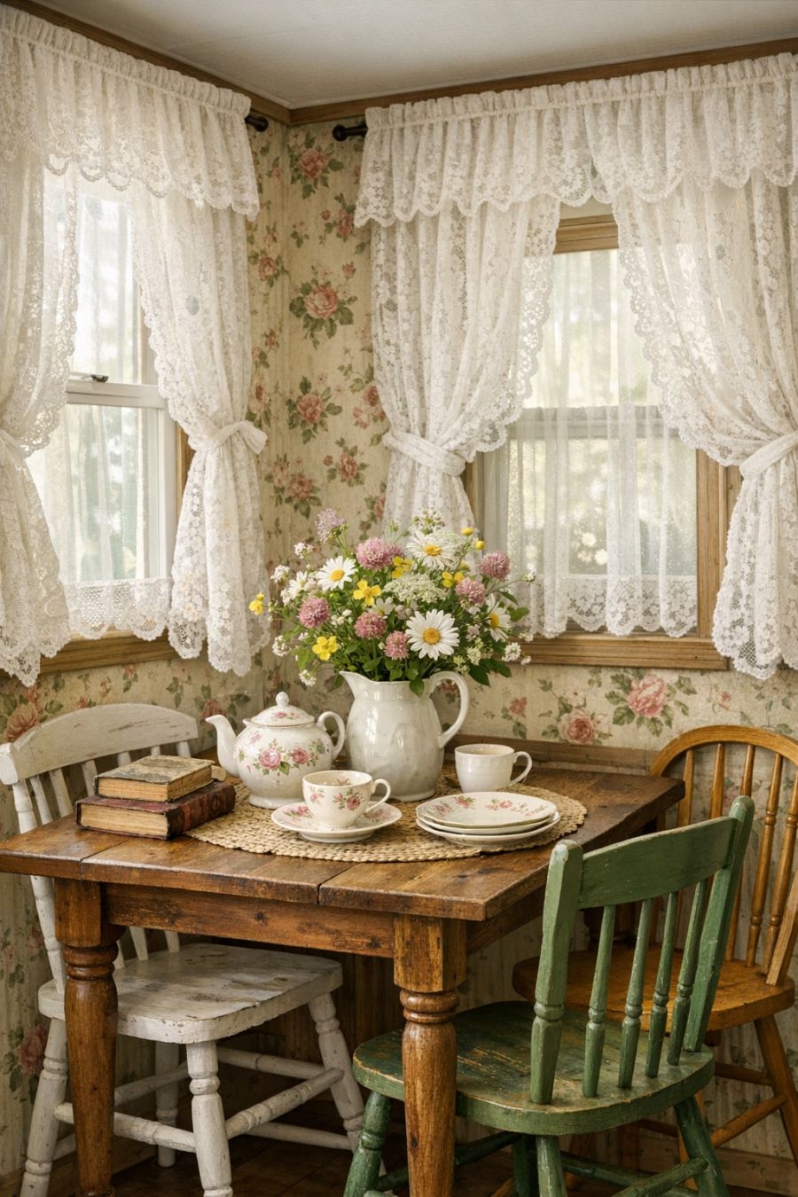 The dining area continues the cottage theme, with a small wooden table set against a backdrop of floral wallpaper. Delicate lace curtains frame the windows, allowing soft natural light to filter through and highlight the room's antique charm. Mismatched chairs add a touch of whimsy, while vintage china and a vase of fresh wildflowers serve as the perfect centerpiece. The intimate space invites lingering meals and heartfelt conversations, making it the heart of this charming home.