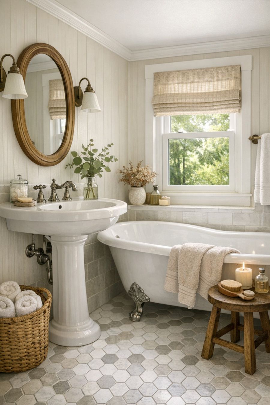 The bathroom is a harmonious blend of elegance and practicality. Light, neutral tones and natural materials create a serene, spa-like atmosphere. A pedestal sink with vintage-style fixtures serves as the room's focal point, complemented by a clawfoot tub that invites leisurely soaks. The floor is laid with hexagonal tiles, offering both aesthetic appeal and functionality. A small window ensures the space is bright and airy, while offering glimpses of the surrounding greenery.