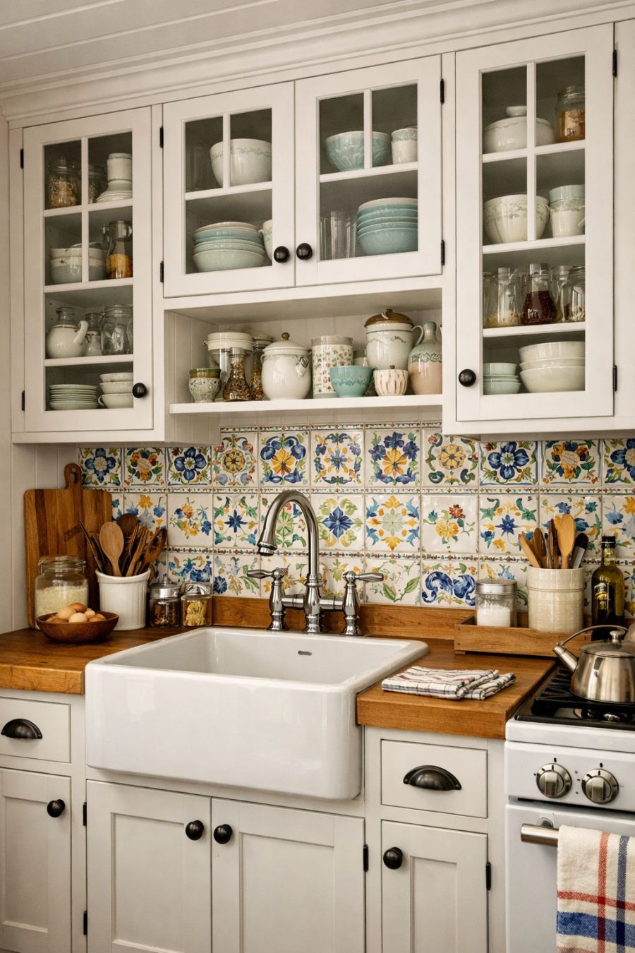 In the kitchen, functionality meets vintage elegance. White cabinetry with glass-paneled doors displays an array of quaint dishware and kitchen essentials. Butcher block countertops provide ample workspace, while a classic farmhouse sink nods to the home's rustic inspiration. The backsplash, crafted from hand-painted tiles, adds a splash of color and artistic flair, making even the most mundane tasks feel like a pleasure.