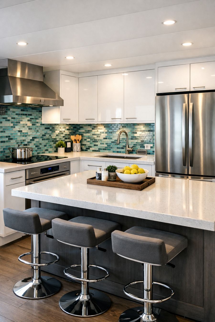 The kitchen area is a masterpiece of both style and functionality, designed with the modern cook in mind. Sleek, white cabinetry provides ample storage space, while the countertops, made of polished quartz, offer both durability and a touch of luxury. Stainless steel appliances, including a state-of-the-art induction cooktop and convection oven, ensure that every culinary need is met. A central island doubles as a breakfast bar, complete with stylish stools that offer a casual dining option. The backsplash features a mosaic of glass tiles in shades of blue and green, echoing the colors of the river and adding a splash of vibrancy to the space.