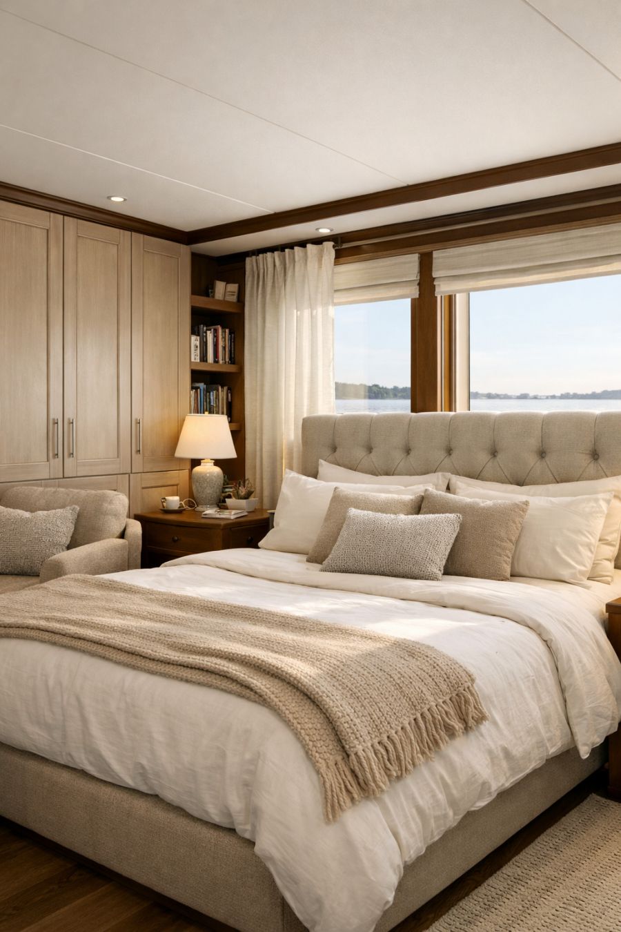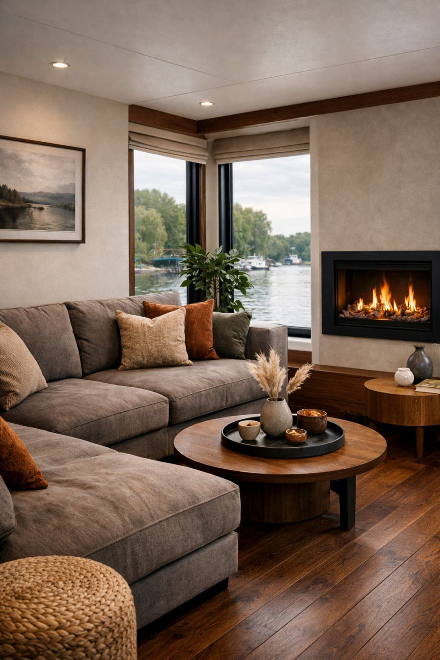 Upon entering the living area, you're greeted by an open and airy space that combines comfort with modern elegance. The walls are adorned with soft, neutral tones that contrast beautifully with the deep, rich hues of the wooden flooring. A plush, oversized sectional sofa in a muted gray fabric invites relaxation, while strategically placed accent pillows in earthy shades add warmth to the room. Large windows offer unobstructed views of the river, and a sleek, wall-mounted fireplace provides both ambiance and warmth on cooler evenings. The decor is minimal yet sophisticated, with a few well-chosen art pieces and potted plants that bring a touch of nature indoors.