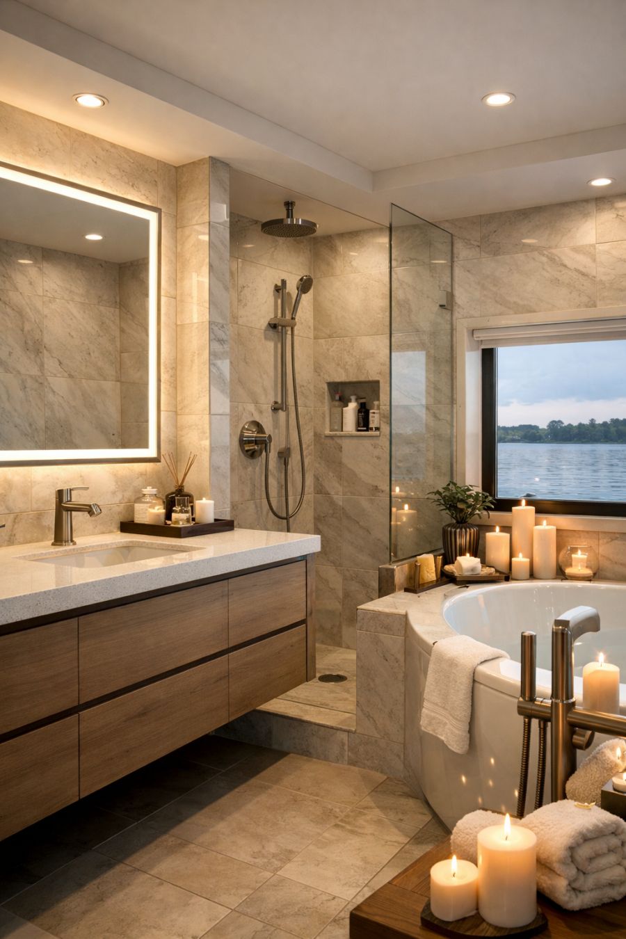 The bathroom is a sanctuary of luxury and style, with a focus on high-quality materials and a soothing color palette. The walls are clad in large, marble-look tiles that extend into the spacious walk-in shower, creating a seamless and elegant backdrop. A floating vanity with a sleek, quartz countertop provides ample space for toiletries, while a large, backlit mirror adds a touch of modern sophistication. The fixtures, finished in brushed nickel, complement the overall design with their clean lines and contemporary appeal. A deep soaking tub offers the perfect place to unwind, surrounded by aromatic candles and soft, ambient lighting.
