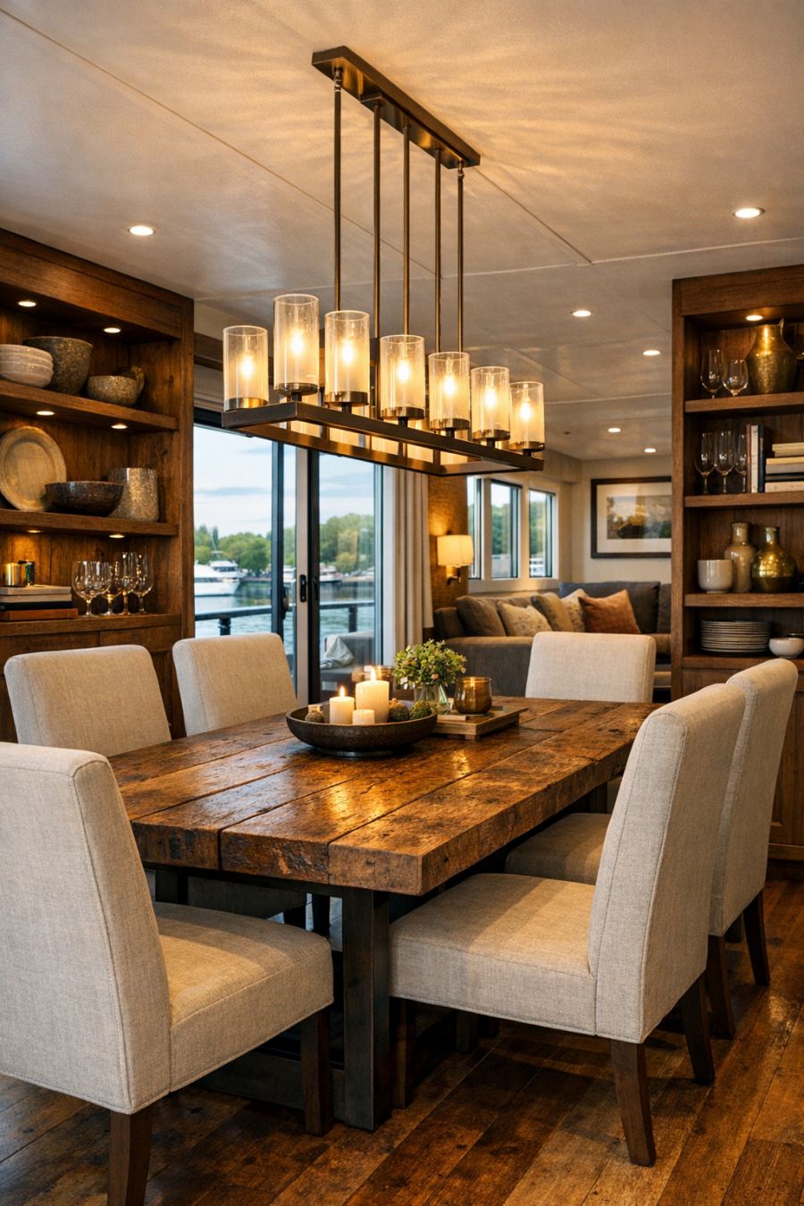 The dining area seamlessly connects with the living space, creating a fluid and welcoming environment for entertaining. A modern, rectangular dining table made of reclaimed wood serves as the centerpiece, surrounded by elegant high-backed chairs upholstered in a soft linen fabric. Above the table hangs a contemporary chandelier that casts a warm glow over the space, enhancing the intimate atmosphere. The walls are lined with custom-built shelving, perfect for displaying an eclectic mix of dinnerware and decorative items. Large windows not only provide stunning views but also allow for ample natural light, creating an inviting and airy atmosphere for meals.