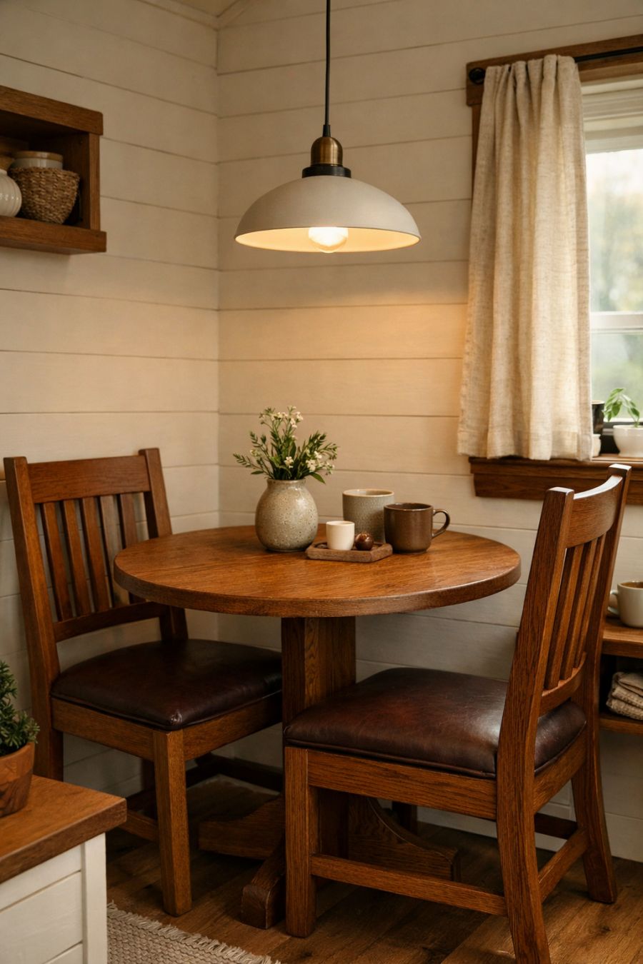 The dining area, though modest in size, is thoughtfully designed to maximize functionality without compromising on style. A small, round wooden table sits elegantly in the corner, flanked by two sleek chairs that echo the craftsman aesthetic. Overhead, a pendant light with a simple, modern design casts a warm glow, creating an inviting atmosphere for meals. The use of natural materials and soft textures ensures that the dining space feels cohesive with the rest of the home's interior design.