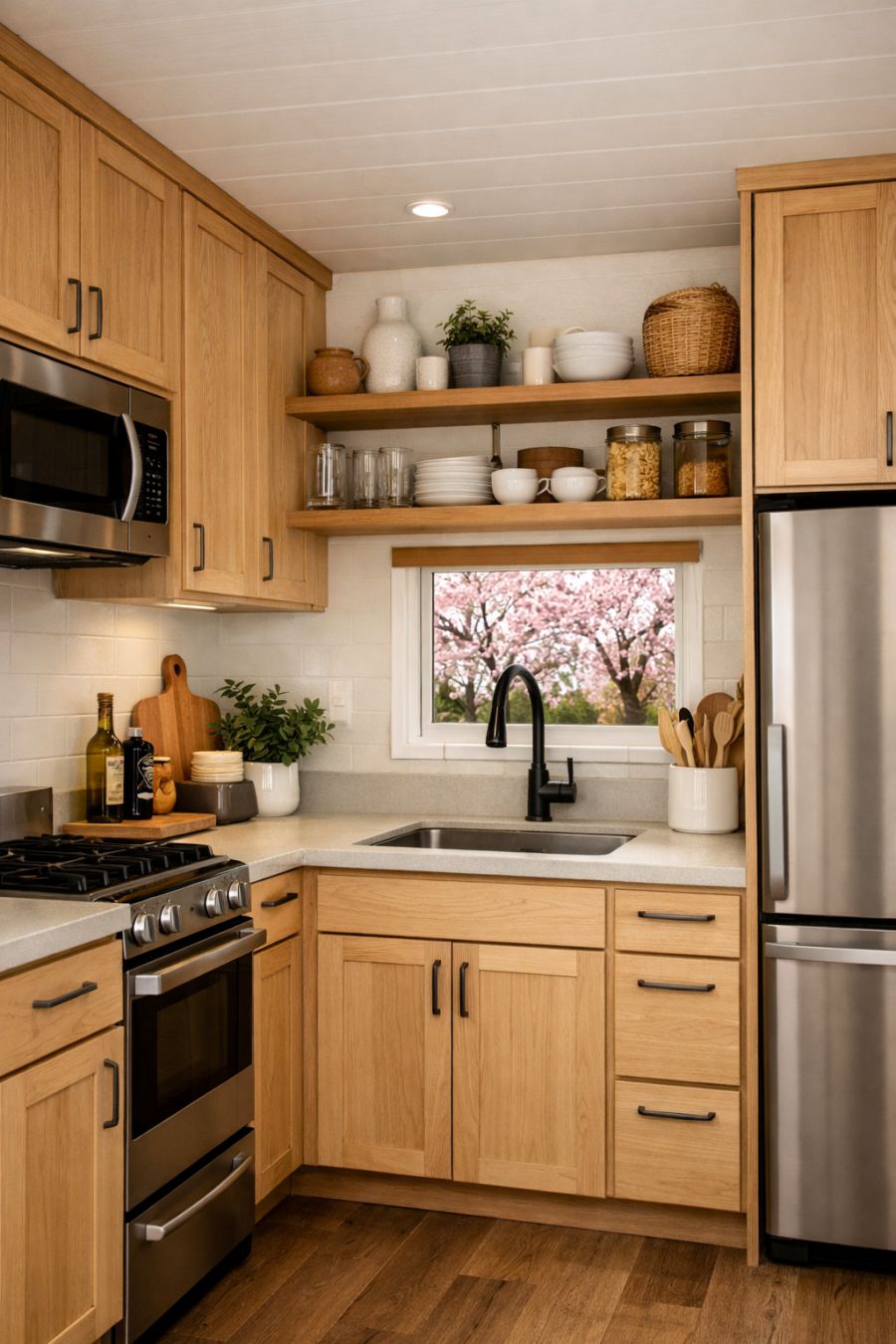 The kitchen area is a masterclass in efficiency and style, with every inch optimized for use. Custom cabinetry in a light, natural wood finish provides ample storage, while open shelving offers a place for decorative items and easy access to everyday essentials. The countertops are crafted from durable, high-quality materials in a soft, neutral hue, complementing the overall aesthetic. Modern appliances are seamlessly integrated into the design, ensuring that functionality is never sacrificed for style. A small window above the sink frames a picture-perfect view of the cherry trees outside, making even the simplest tasks a joy.
