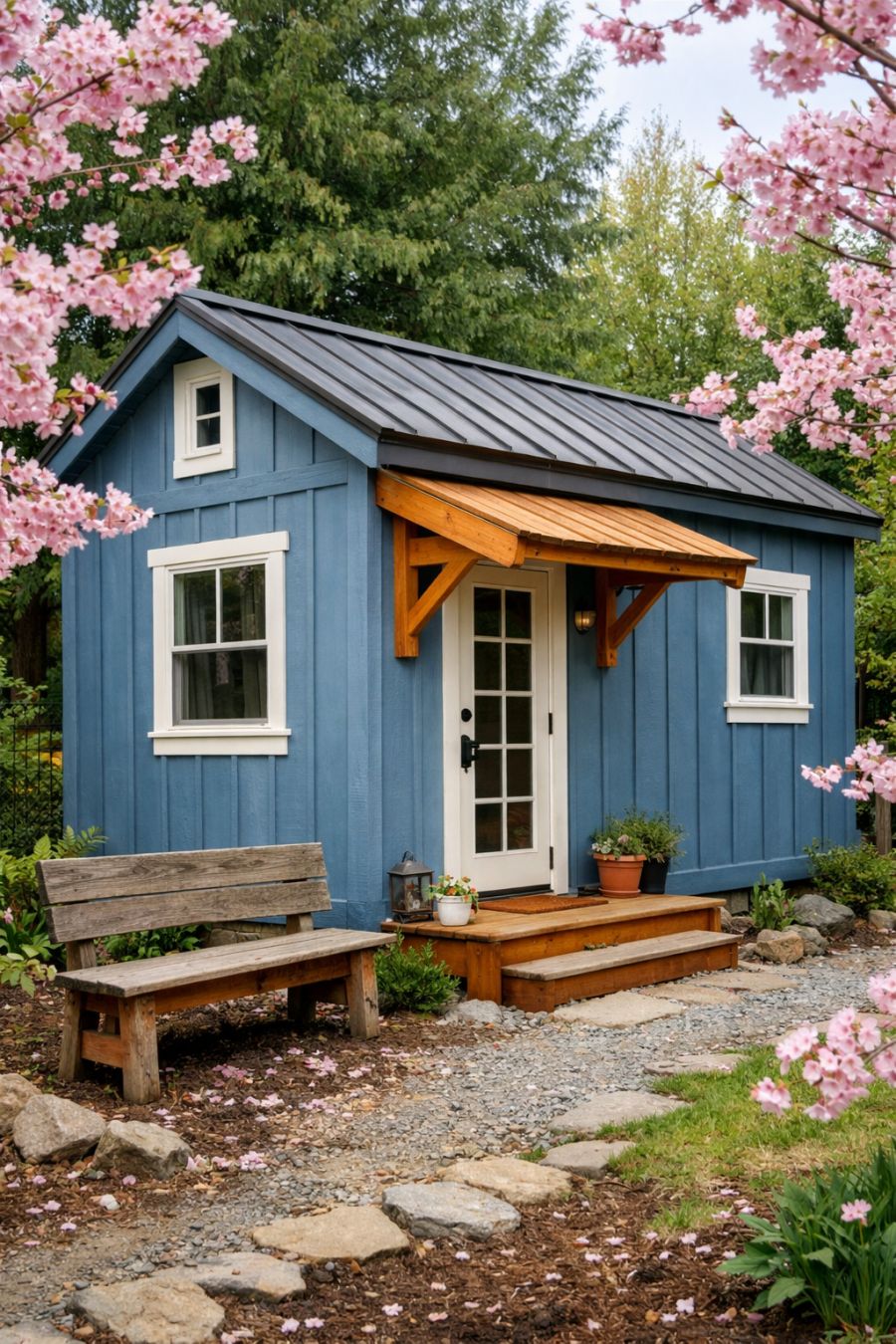The exterior of this charming tiny home is a visual delight, painted in a soothing dusty blue that harmonizes beautifully with the natural surroundings. The board-and-batten siding adds texture and depth, giving the home a rustic yet refined appearance. A warm cedar awning extends over the entrance, offering protection from the elements and a touch of natural warmth. In front of the house, a small wooden bench invites you to sit and enjoy the blossoming cherry trees, which add a splash of color and life to the setting. The amateur photography captures the home from a 3/4 angled view, highlighting its quaint and inviting nature.