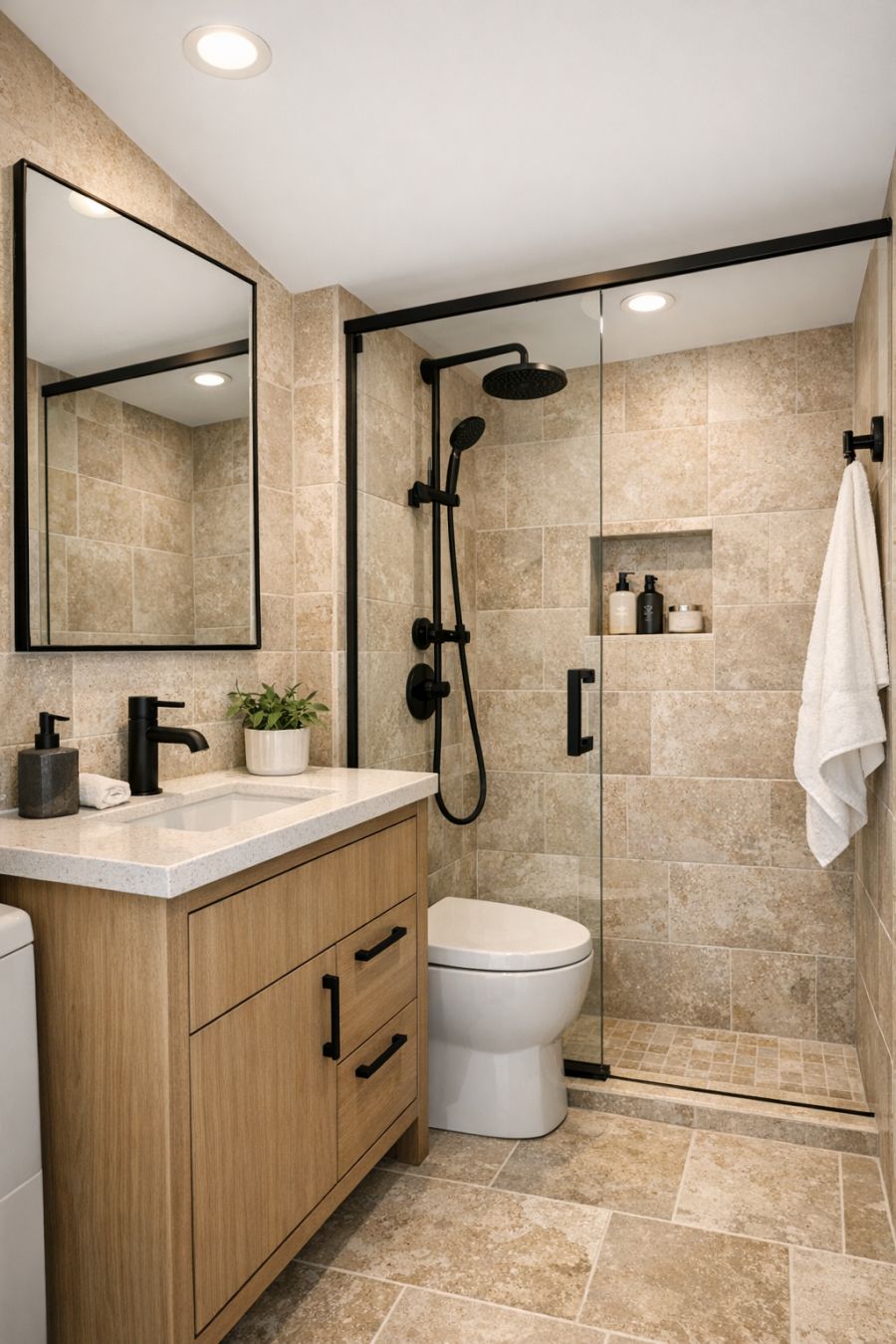 The bathroom in this tiny home marries functionality with elegance, featuring a clean and modern design. Natural stone tiles in soft, earthy tones line the floor and walls, creating a spa-like atmosphere. A compact yet stylish vanity provides essential storage, while a frameless mirror enhances the sense of space. The shower area is cleverly designed with a glass partition, ensuring the space remains open and airy. High-quality fixtures in matte black add a touch of contemporary sophistication, complementing the overall aesthetic and ensuring that every element is both beautiful and practical.