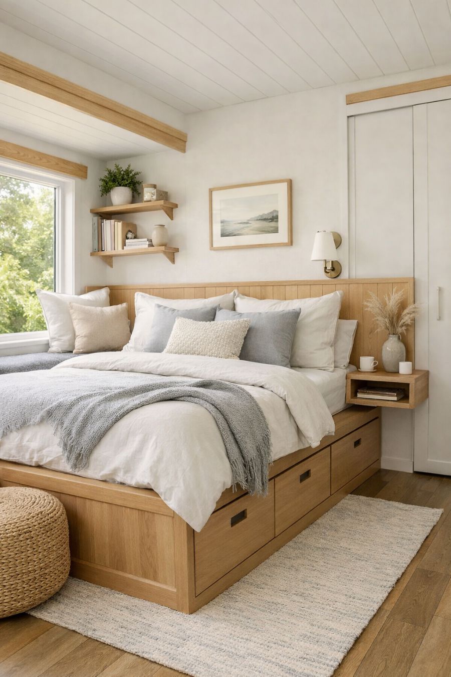 The bedroom is a serene retreat, designed to offer both comfort and tranquility. A platform bed with built-in storage maximizes space, while soft linens and plush pillows create an inviting place to rest. The color palette is kept light and calming, with shades of white and soft grays complemented by natural wood accents. Thoughtful details, such as a small reading nook by the window and a streamlined wardrobe, enhance the room's functionality without detracting from its peaceful ambiance. Large windows ensure plenty of natural light, maintaining the connection with the outdoors.