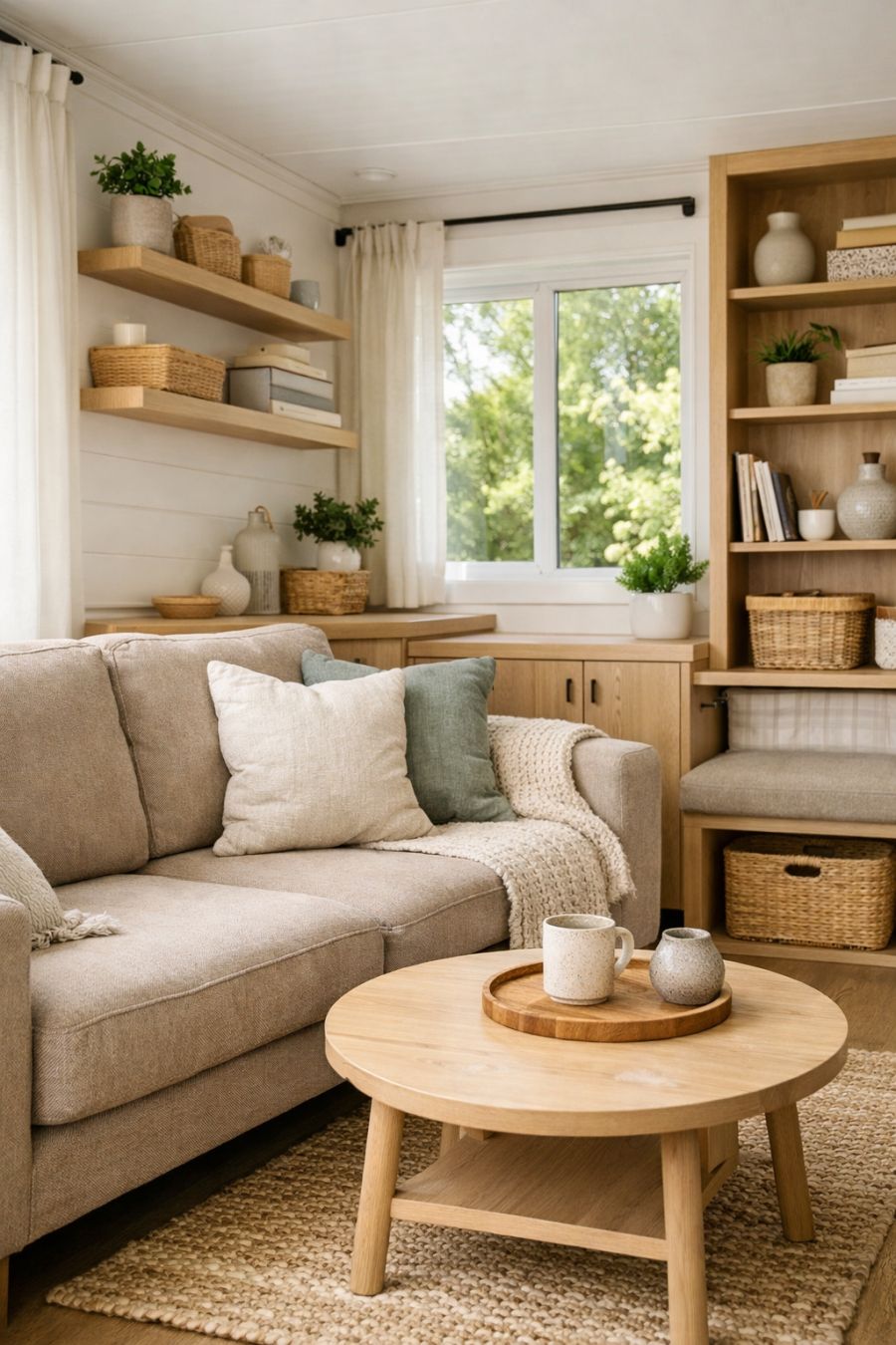 Stepping inside, the living area greets you with an open and airy atmosphere, despite its compact size. The interior design embraces a minimalist style with Scandinavian influences, featuring light wood tones and soft, neutral colors. Large windows allow natural light to flood the space, enhancing the sense of openness and connecting the indoors with the lush greenery outside. A cozy, earth-toned sofa invites relaxation, while strategically placed shelves and storage solutions maintain a clean and uncluttered environment.