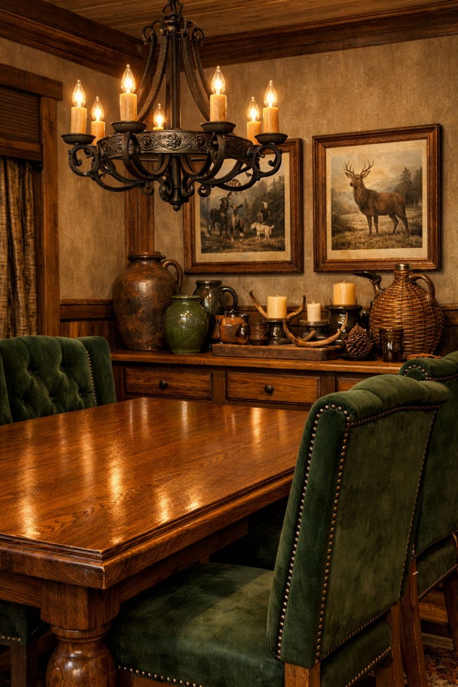 The dining area continues the lodge theme with a solid oak table surrounded by high-backed chairs upholstered in deep green velvet. A wrought iron chandelier hangs overhead, casting a warm light on the polished wood surface below. The walls are adorned with vintage hunting prints, and a sideboard displays an array of rustic ceramics and glassware. The space is designed for intimate gatherings, evoking the feel of a grand feast in a highland retreat.