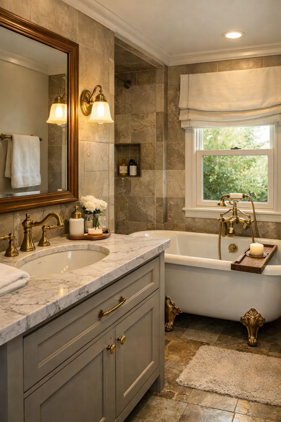 The bathroom is a study in understated elegance, with natural stone tiles lining the floor and shower walls. A clawfoot tub sits beneath a window, offering a serene spot for relaxation. The vanity features a marble countertop with a porcelain sink, complemented by brass fixtures that add a touch of vintage charm. A large mirror reflects the room's soft lighting, enhancing the space's warm and inviting atmosphere.