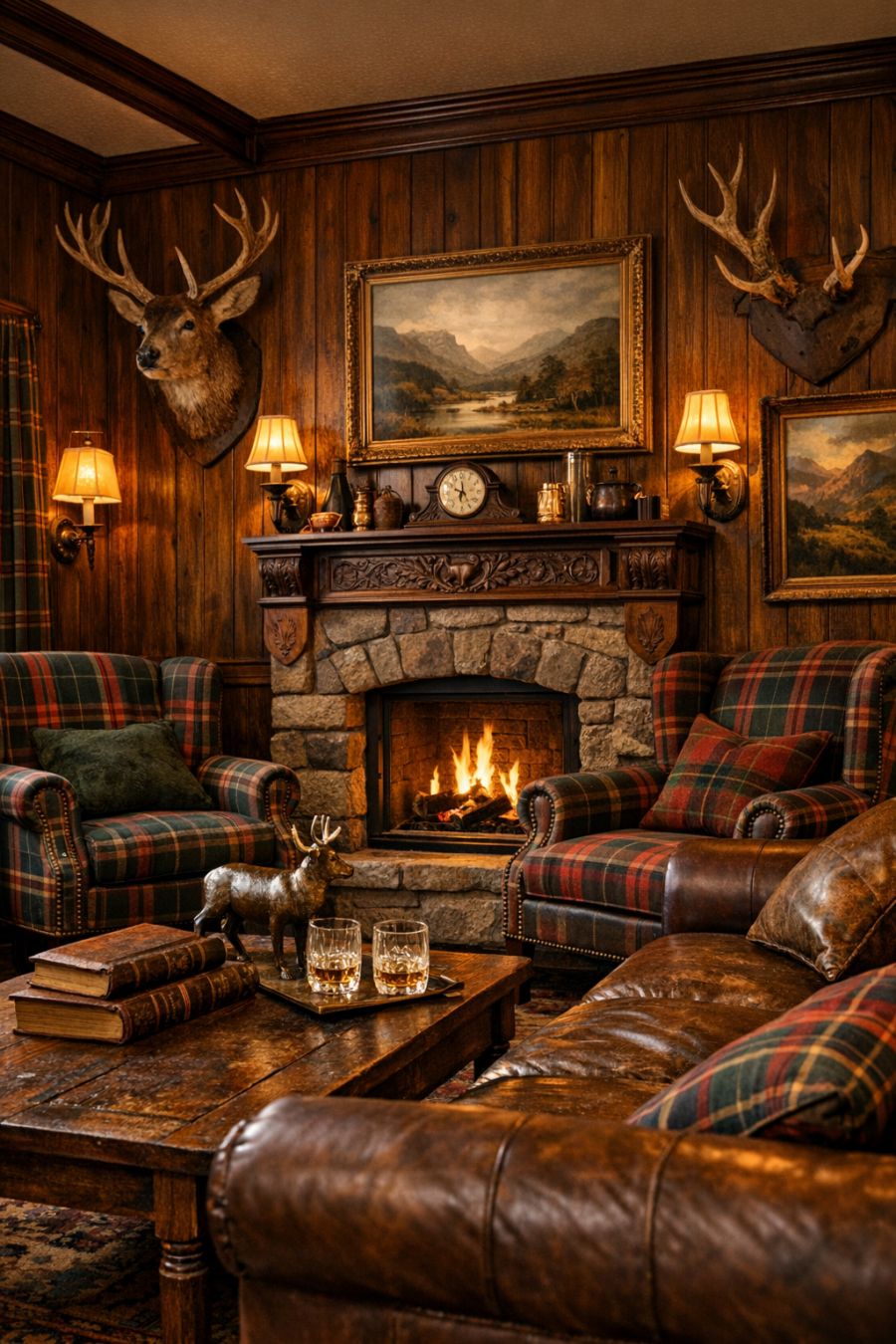 Stepping inside, one is immediately transported to the ambiance of a classic Scottish hunting lodge. The living area features dark, rich wood paneling that envelops the room in warmth and history. Plush tartan-patterned armchairs and a leather sofa create a cozy seating area around a stone fireplace, complete with an intricately carved wooden mantle. Antique sconces cast a soft glow, illuminating the mounted antlers and landscape paintings that adorn the walls, adding to the room's lodge-like charm.