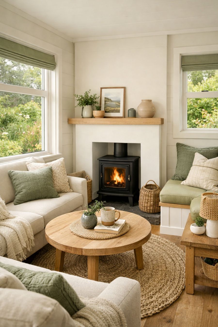 Step inside to find a living area that is as stunning as it is inviting. The space is bathed in natural light, thanks to strategically placed windows that offer picturesque views of the garden outside. The interior design features a neutral palette with hints of sage green to maintain continuity with the exterior, while plush seating arrangements invite relaxation and conversation. Tasteful decor elements, such as textured throw pillows and woven rugs, add layers of comfort and visual interest. A minimalist yet charming fireplace serves as a focal point, providing warmth and ambiance on cooler days.